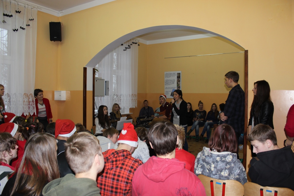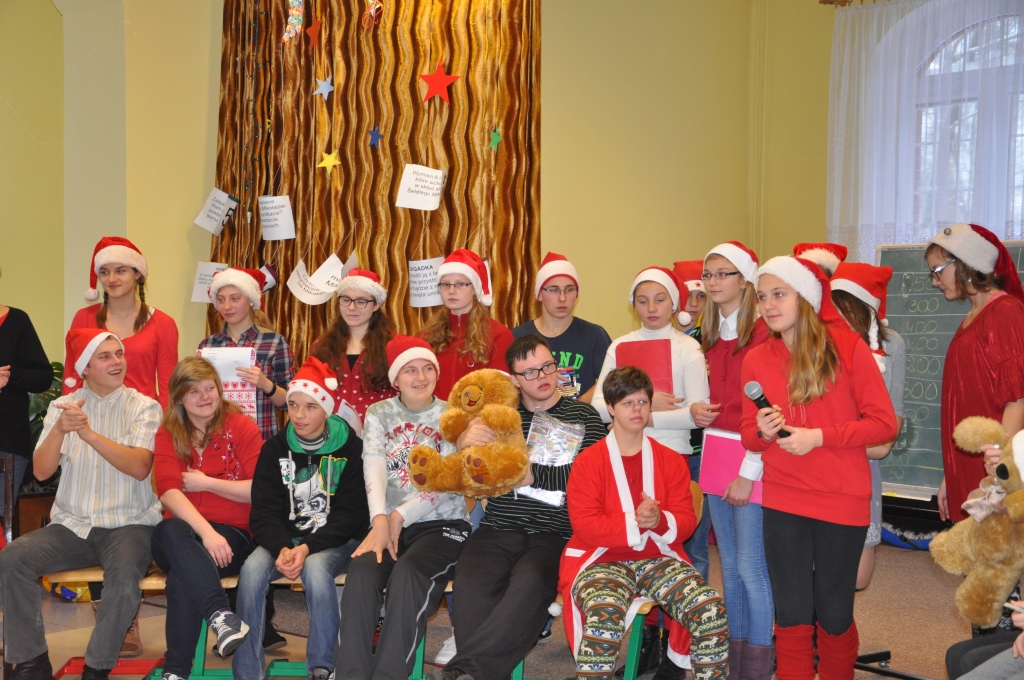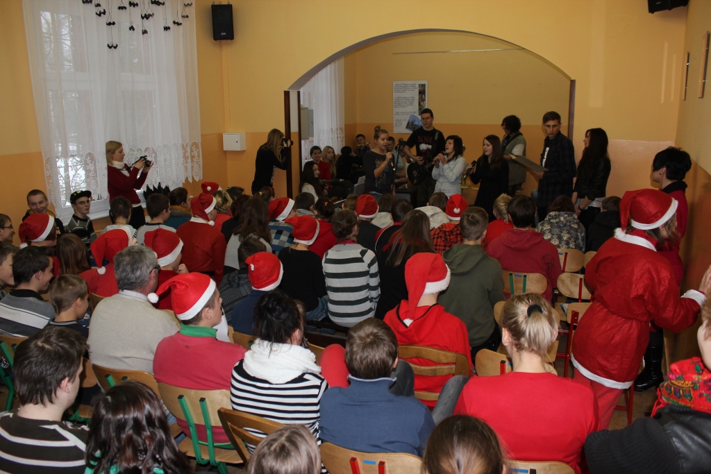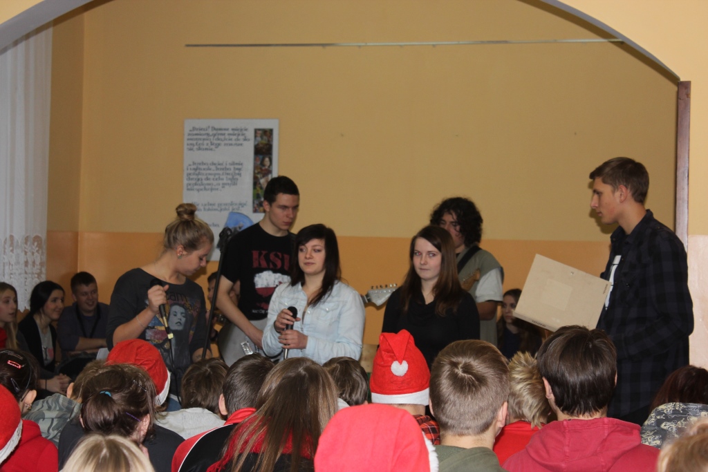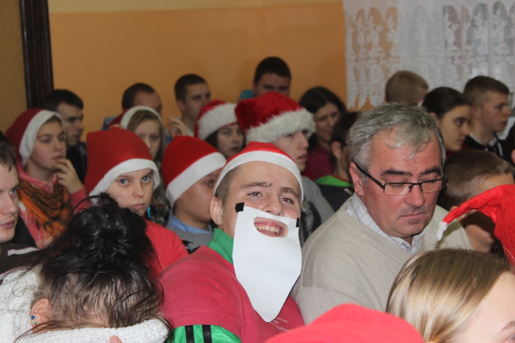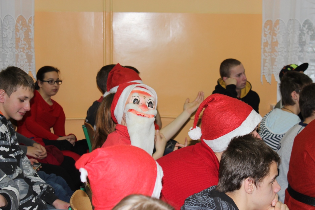 „Familiada”. W zabawie rywalizowali między sobą nauczyciele oraz uczniowie. Osobą prowadzącą był „ Święty Mikołaj”, w którego rolę wcieliła się pani opiekun uczniów z Gimnazjum w Bolszewie.