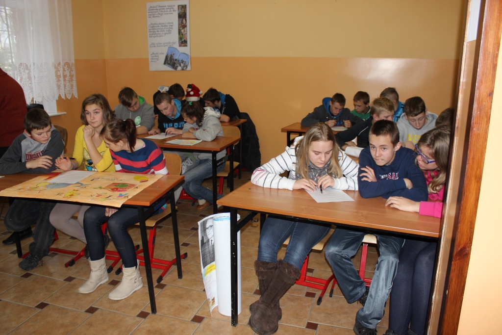 Dnia 17 grudnia w Auli Zasadniczej Szkoły Zawodowej odbył się konkurs pt:” Brzechwa w liczbach”, w którym brali udział wszyscy uczniowie klas gimnazjalnych. Konkurowali oni ze sobą, przygotowując do oceny Jury klasowy plakat z życiorysem i twórczością Jana Brzechwy. Dodatkowo w trzy osobowych zespołach uczniowierozwiązywali zagadki, odpowiadali na pytania ze znajomości utworów tj: „ Kaczka dziwaczka”, „Leń” czy „Zoo”. Rozwiązywali również zadania matematyczne, obliczając długość życia poety, zapisywali daty cyframi rzymskimi, określali wiek. Ponadto, jedna osoba z każdej klasy recytowała wiersz znanego poety, jeden z uczniów nawet „zarapował” wybrany utwór.