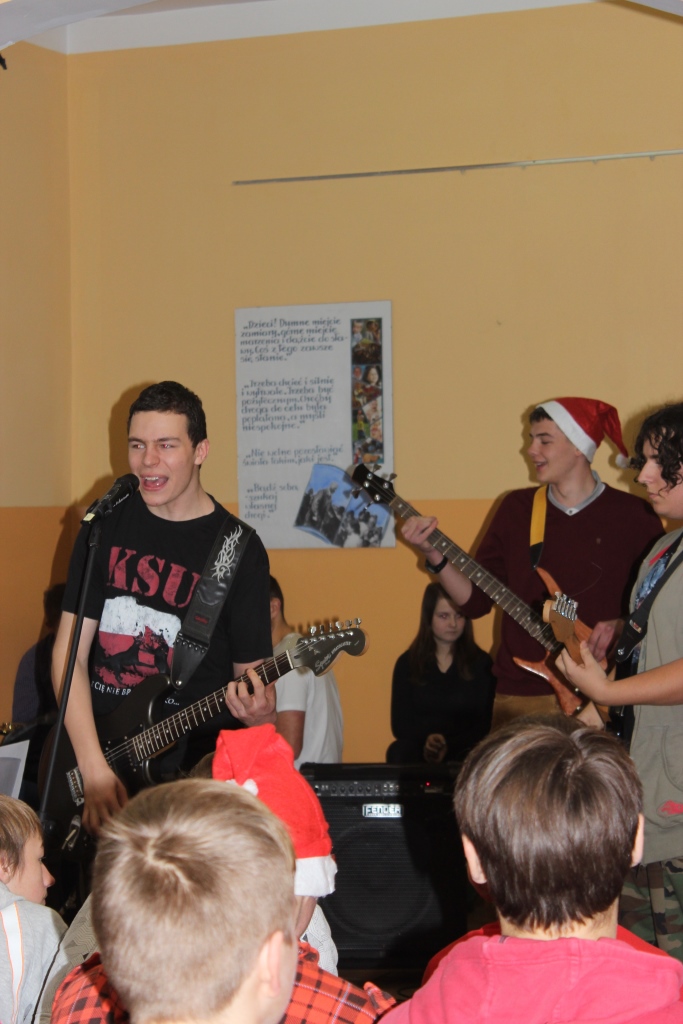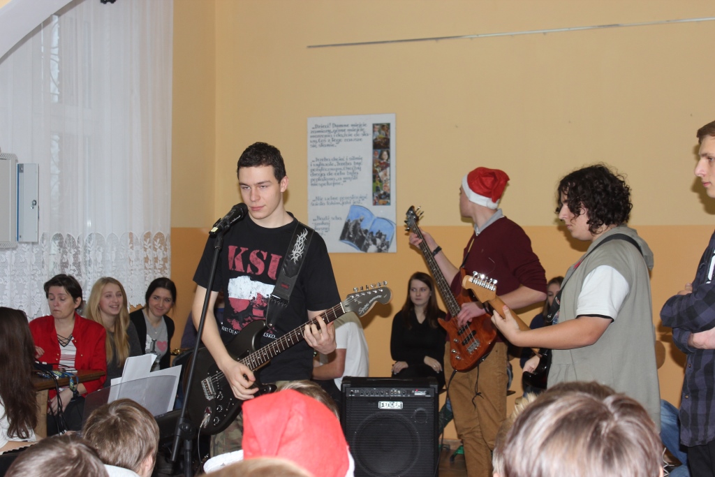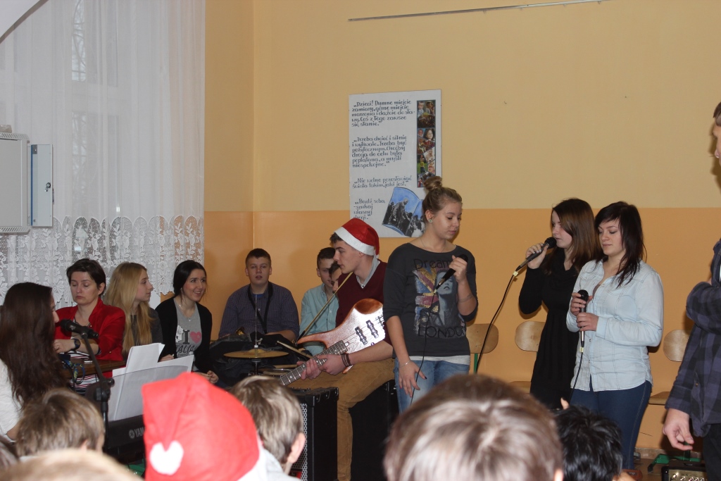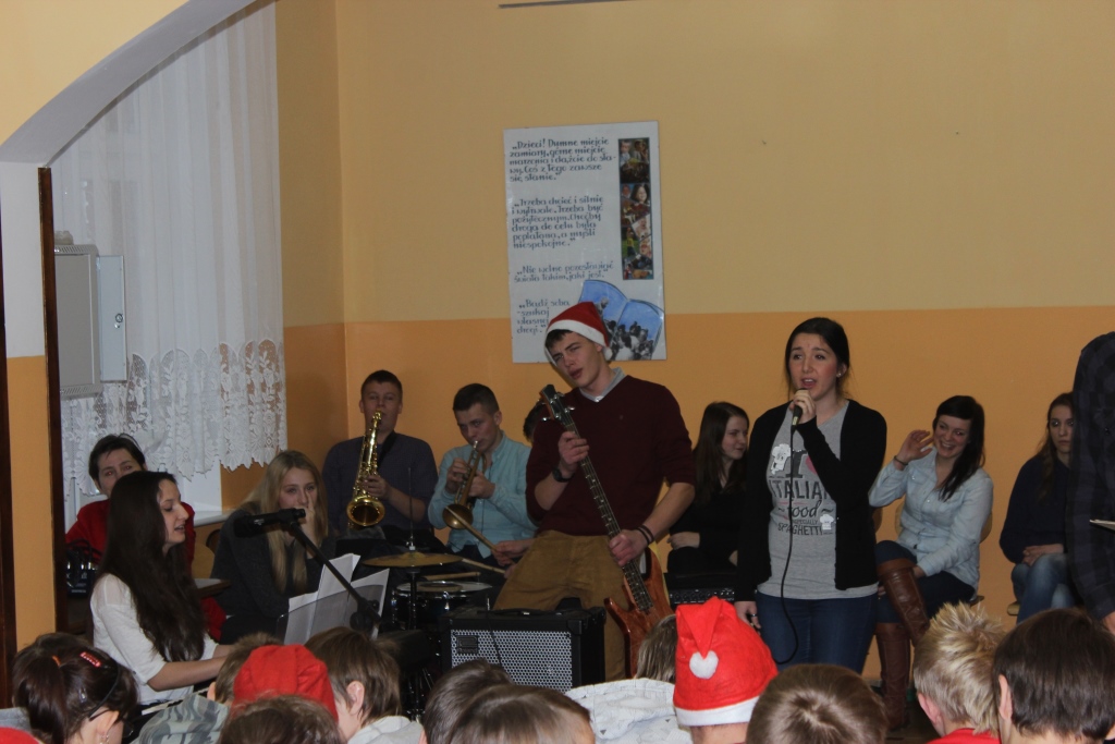 Na powitanie uczniowie Szkoły Podstawowej i Gimnazjum zet zaśpiewali wszystkim piosenkę pt: „ Mikołaj na motorze” . Dzieci klas IV-VI zaprezentowały utwór : „Mikołaj i Elfy” przy akompaniamencie dzwonków diatonicznych.
