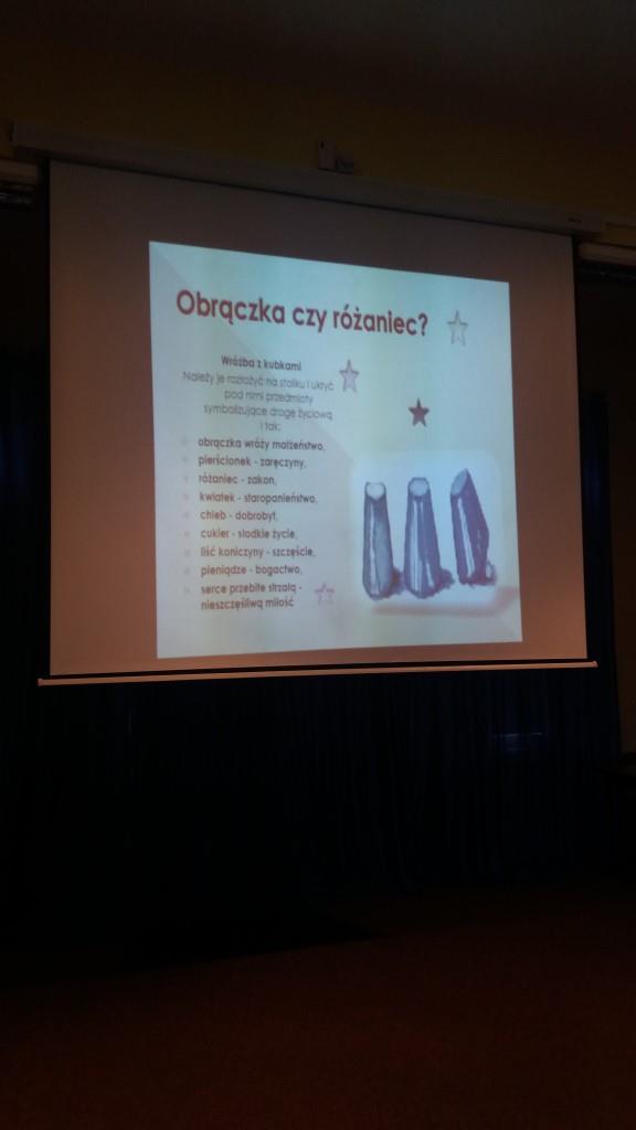 Dzięki prezentacji multimedialnej poznali historię tego święta. Następnie odbyła się wróżba z karteczkami. Wylosowane ilustracje symbolizowały drogę życiową. Należy podkreślić, że wróżby miały charakter orientacyjny, liczyła się dobra zabawa. Wielu uczniów obawiało się, że wróżby mogą być niezbyt pomyślne. Okazało się jednak, że prawie wszystkie dziewczęta wyjdą kiedyś za mąż, a chłopcy znajdą swoje żony. Dzięki wróżbom dowiedzieliśmy się również jacy jesteśmy, kim będziemy w przyszłości, jakie czekają na nas sukcesy, itp. Podczas zabawy śmiechu było co niemiara. Czas pokaże, czy choć trochę spełnią się andrzejkowe wróżby. Dużo dobrego humoru i pozytywnych emocji dostarczyły uczniom dwie zabawy taneczne. Królowały oczywiście najnowsze hity z list przebojów, więc zabawa była przednia.