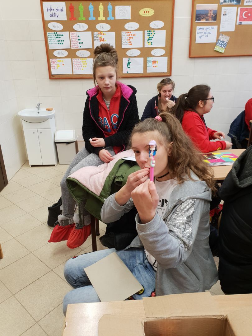 Nauczanie języka niemieckiego opiera się w głównej mierze na stosowaniu elementów metody komunikacyjnej, z wykorzystaniem nowoczesnych technik audiowizualnych oraz technologii informacyjno-komunikacyjnych. Podczas lekcji uczniowie rozmawiają z młodzieżą z innego kraju za pośrednictwem komunikatora Skype, wymieniają się informacjami i doświadczeniami na portalu Twinspace. W okresie Świąt Bożego Narodzenia zrobiliśmy kartki świąteczne i przygotowaliśmy dla każdego uczestnika drobny upominek. W styczniu dotarła do nas paczka z Turcji, również dostaliśmy słodkości, kartki i ostre orzeszki. Wszyscy uczestnicy projektu są bardzo zadowoleni ze współpracy z panią Leylą i jej uczniami z Çorum.