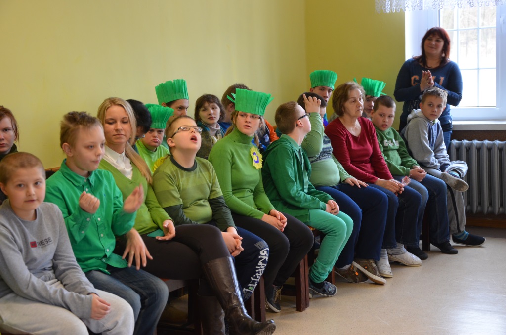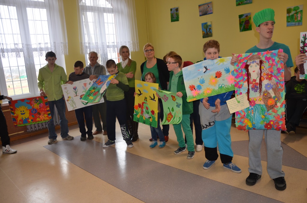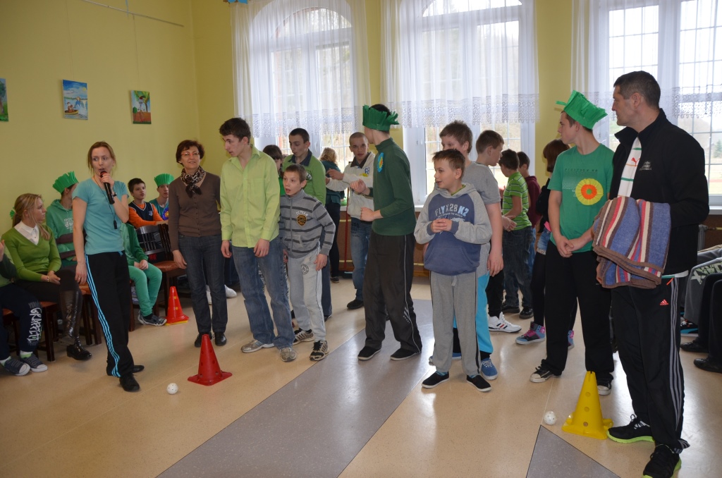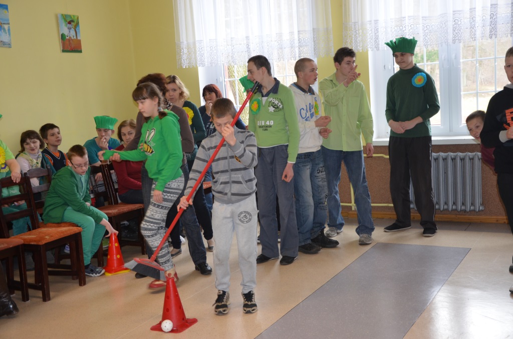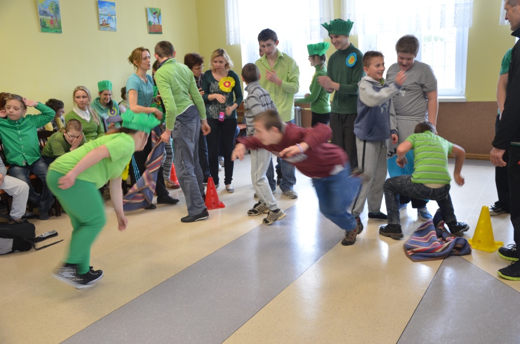 najbardziej zielono – ubranych uczestników zabawy. Nagrodziliśmy ich drobnymi upominkami i gromkimi brawami. Z grona nauczycieli wyróżniły się panie Celina Szachowska i Danka Knopik- Jażdżewska. Później przedstawiciele poszczególnych klas zaprezentowali konkursowe prace plastyczne. Wybrano JURY, ale prace były tak piękne, że nie byliśmy w stanie wybrać trzech najlepszych. Wystawę będzie można obejrzeć w budynku szkoły podstawowej i tzw. małej szkole. Panie Marzena Barzowska i Agnieszka Jakusz przeprowadziły kilka konkurencji sportowych z elementami rywalizacji. Na zakończenie wszyscy udali się na ognisko przygotowane pod kierunkiem pana Artura Jakusza, gdzie z wielkim apetytem