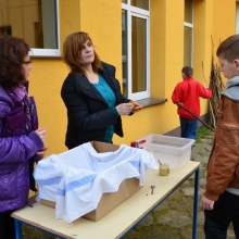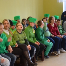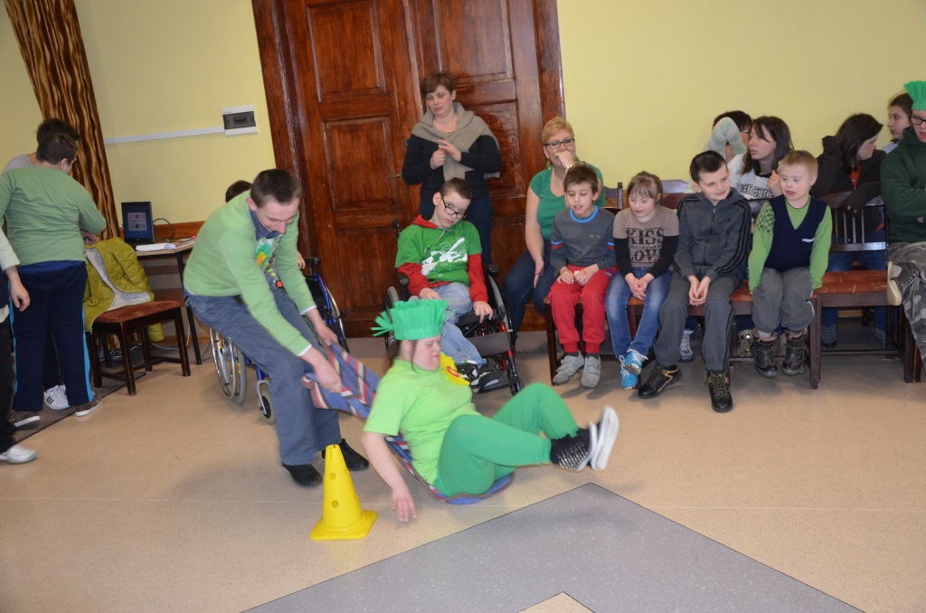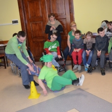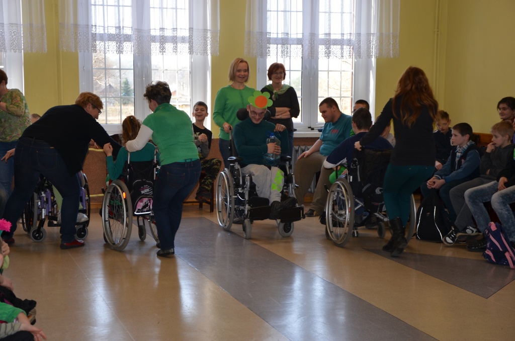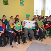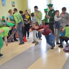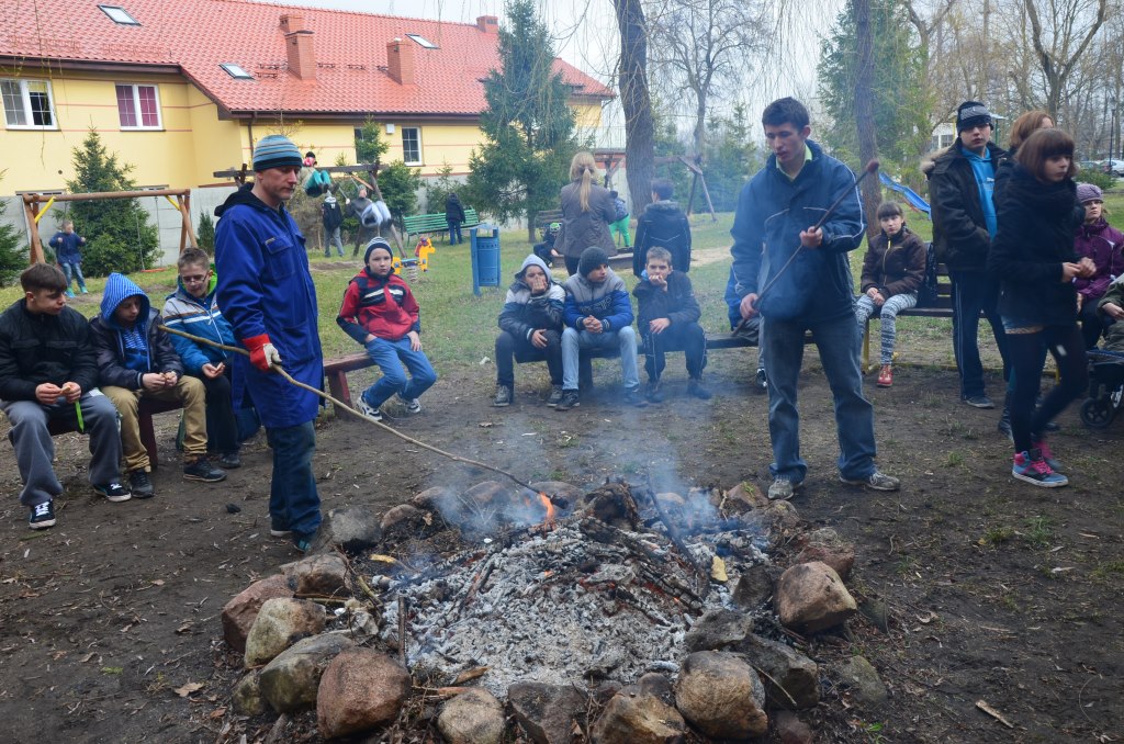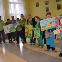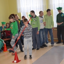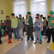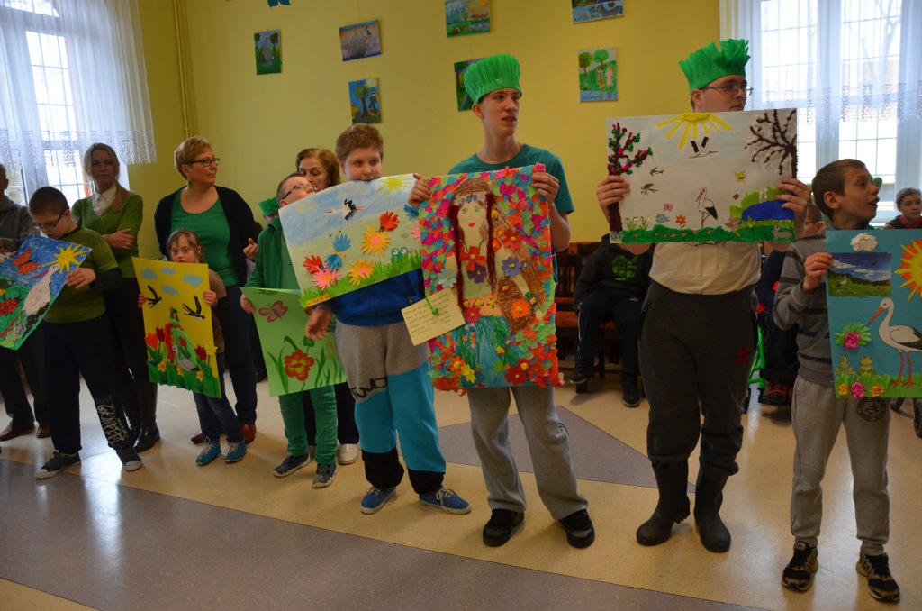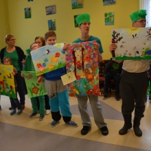 najbardziej zielono – ubranych uczestników zabawy. Nagrodziliśmy ich drobnymi upominkami i gromkimi brawami. Z grona nauczycieli wyróżniły się panie Celina Szachowska i Danka Knopik- Jażdżewska. Później przedstawiciele poszczególnych klas zaprezentowali konkursowe prace plastyczne. Wybrano JURY, ale prace były tak piękne, że nie byliśmy w stanie wybrać trzech najlepszych. Wystawę będzie można obejrzeć w budynku szkoły podstawowej i tzw. małej szkole. Panie Marzena Barzowska i Agnieszka Jakusz przeprowadziły kilka konkurencji sportowych z elementami rywalizacji. Na zakończenie wszyscy udali się na ognisko przygotowane pod kierunkiem pana Artura Jakusza, gdzie z wielkim apetytem