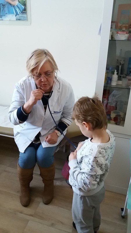 Zapoznaliśmy się również z pracą, jaką wykonuje kucharz i zawitaliśmy w kuchni PZKS, by poznać tajniki tego zawodu. Następnego dnia w swoim gabinecie serdecznie przyjęły nas panie pielęgniarki. Opowiedziały, czym się zajmują i pokazały przedszkolakom sprzęt, jakim dysponują. Mogliśmy się zważyć, zmierzyć i zbadać termometrem oraz stetoskopem.
