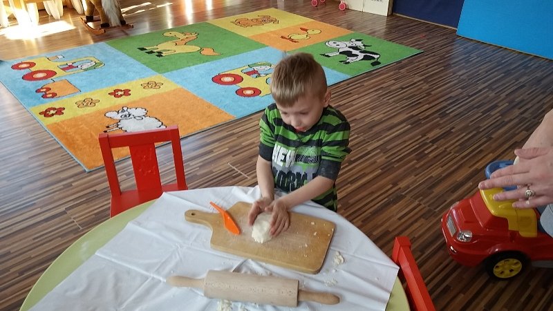 Kolejnego dnia mówiliśmy o pracy, jaką wykonuje piekarz. Chcieliśmy jak on spróbować ulepić chleb, tylko z masy solnej. Zabrakło nam soli, więc wybraliśmy się do sklepu spożywczego niedaleko przedszkola. Przestrzegając zasad bezpiecznego zachowania przy ruchliwej ulicy oraz właściwego przechodzenia przez jezdnię dotarliśmy do sklepu. Kupiliśmy sól oraz pieczywo.