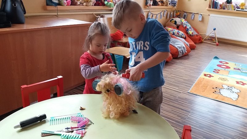 Sami również próbowaliśmy pobawić się w fryzjerów i zajęliśmy się jedną z naszych przedszkolnych lalek. Czesaliśmy ją, upinaliśmy jej włosy, ale najfajniejsze było nakładanie pianki na włosy, utrwalającej fryzurę.