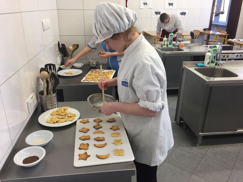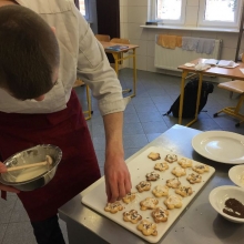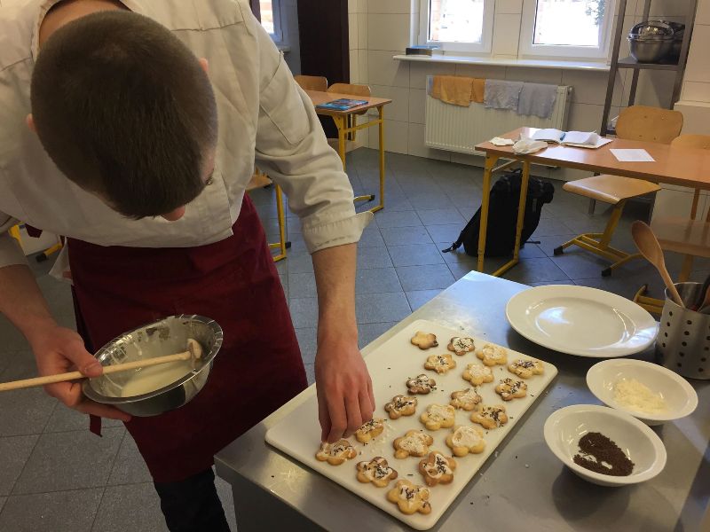 Uczniowie klasy 3b cały czas pilnie przygotowują się do nadchodzących egzaminów zawodowych. Nasi przyszli kucharze na zajęciach z pracowni gastronomicznej, przygotowywali ostatnio pyszne kruche ciasteczka. Szybko zniknęły z blach, gdyż były tak pyszne. W Szkole unosił się zapach tak intensywnie, że przyciągał innych uczniów do pracowni gastronomicznej, z której to tak pachniało:)