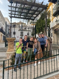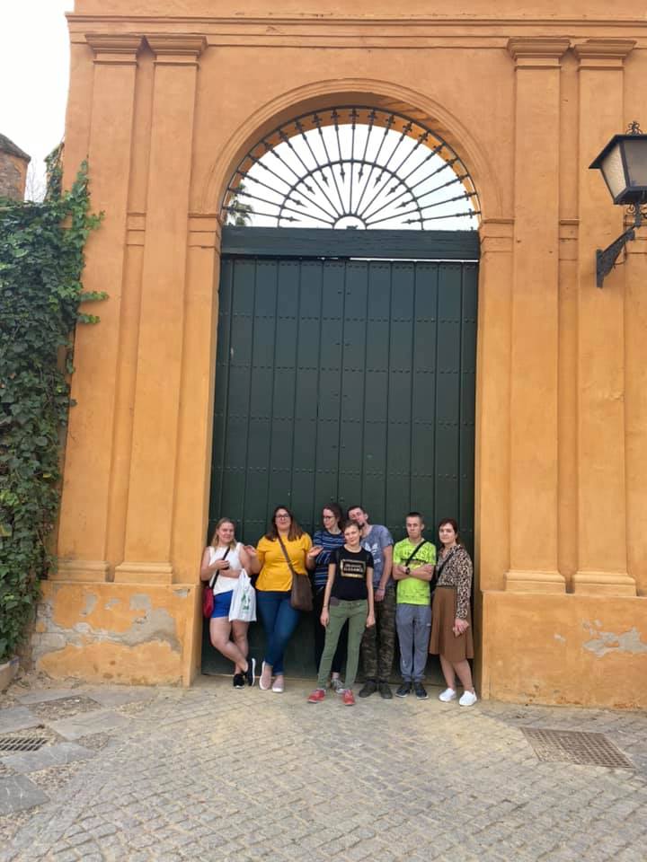 Dzień rozpoczął się jak codzień, dzisiaj towarzyszyliśmy w bojach Korneli Hebel oraz Mikołajowi Szołdra. Na fotografiach poniżej ich dresscode , po praktykach krótkie lenistwo na tarasie, a następnie po raz kolejny ruszyliśmy w podbój miasta. Sewilla wciąż chowa przed nami wiele ciekawych miejsc. Wysiedliśmy z autobusu lini 26 i nie planując skręciliśmy do parku. Otaczała nas przepiękna egzotyczna roślinność. Palmy, kwitnące krzaki hortensji, drzewka pomarańczowe, papugi 🦜 oraz wiele roślin których nie znamy. W owym parku (ogrody Murillo) umiejscowiony został pomnik na cześć Krzysztofa Kolumba (Cristobal Colon) z przepiękna rzeźba statku na którym zostało napisane z jednej strony ISABEL, z drugiej FERNANDO, na cokole ukazuje się płaskorzeźba przedstawiająca twarz Krzysztofa Kolumba otoczona wieńcem. Prosto z parku udaliśmy się pospacerować, pobłądzić po ciasnych uliczkach starego miasta w poszukiwaniu pocztówek, pamiątek i pięknych widoków ukazujących się naszym oczom.