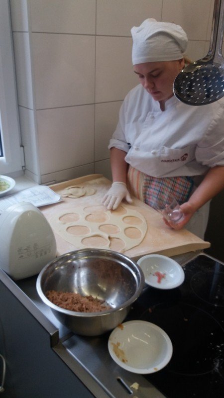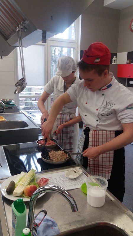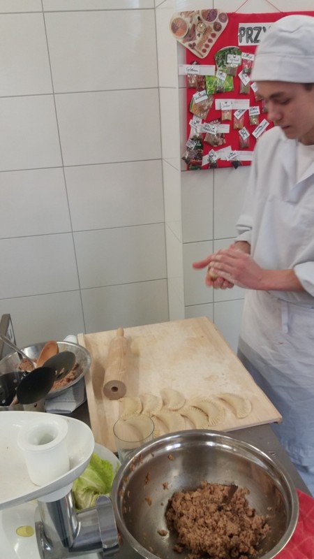 Zadanie egzaminacyjne polegało na  przygotowaniu zgodnie z zamieszczonymi recepturami  po dwa zestawy potraw składających się z pierogów z mięsem oraz surówki z kapusty pekińskiej.