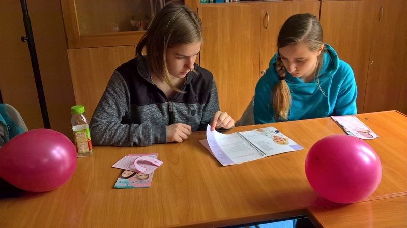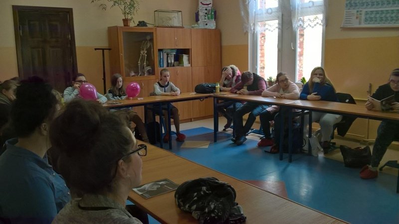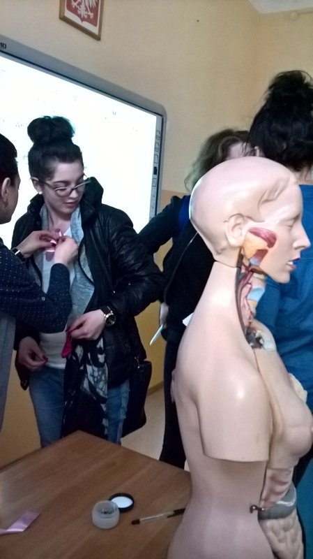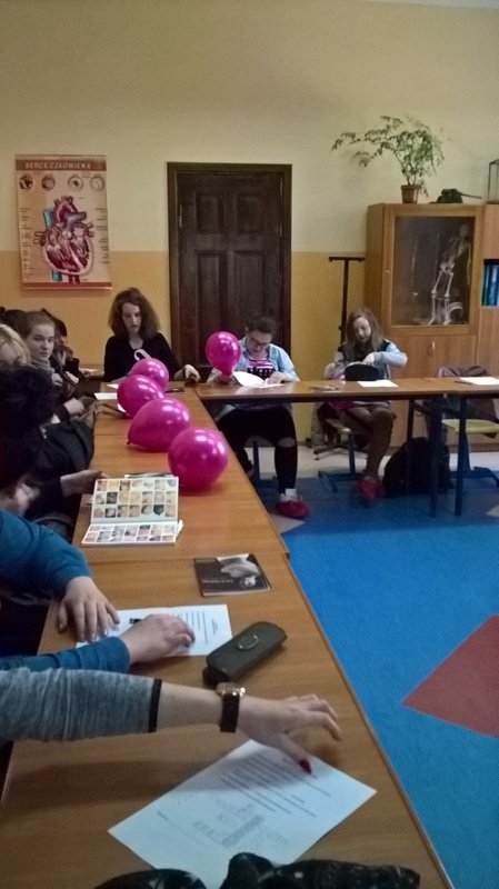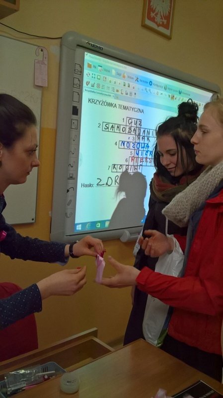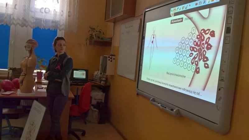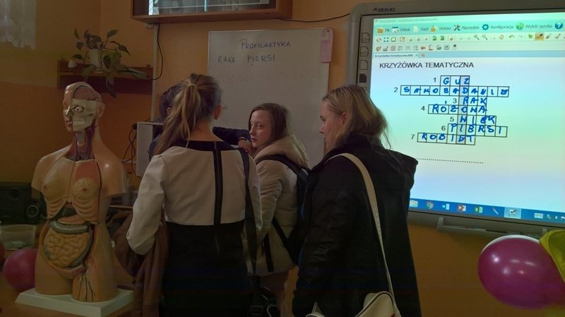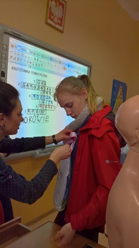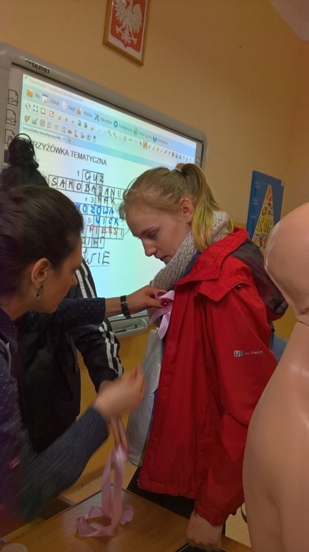 6 kwietnia w gimnazjum i ZSZ upłynął pod hasłem „Różowa wstążeczka”. Tego dnia przeprowadzono warsztaty profilaktyki raka piersi i chorób nowotworowych. W zajęciach uczestniczyły dziewczynki z trzeciej klasy gimnazjum i uczennice zasadniczej szkoły zawodowej. Marzena Kuczkowska – nauczycielka biologii i chemii oraz Zofia Pioterek – nauczycielka wychowania do życia w rodzinie przeprowadziły pogadankę na temat czynników ryzyka zachorowania na raka piersi. Dodatkowo wyjaśniły techniki samobadania, przedstawiły prezentację ukazującą statystyki występowania choroby u kobiet i mężczyzn oraz omówiły sposoby diagnozowania i leczenia. Tematyka związana z rakiem piersi cieszyła się sporym zainteresowaniem wśród uczennic, które zadawały wiele pytań i z uwagą śledziły prezentację. Na zakończenie uczestniczki rozwiązywały na tablicy interaktywnej krzyżówkę dotyczącą zdrowia.