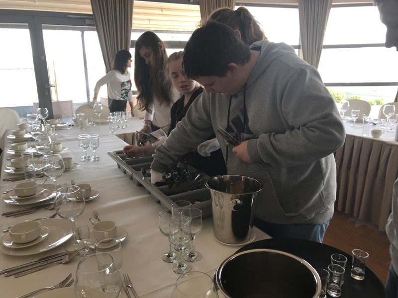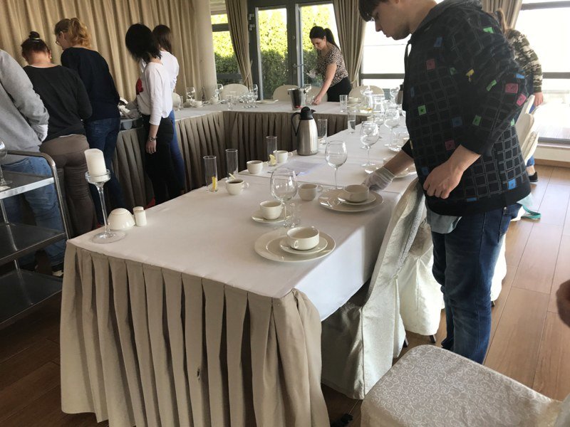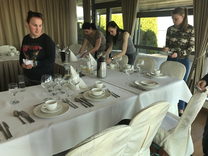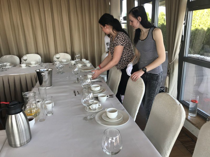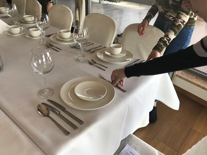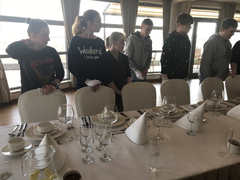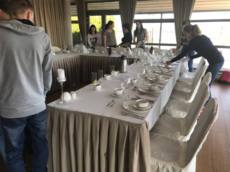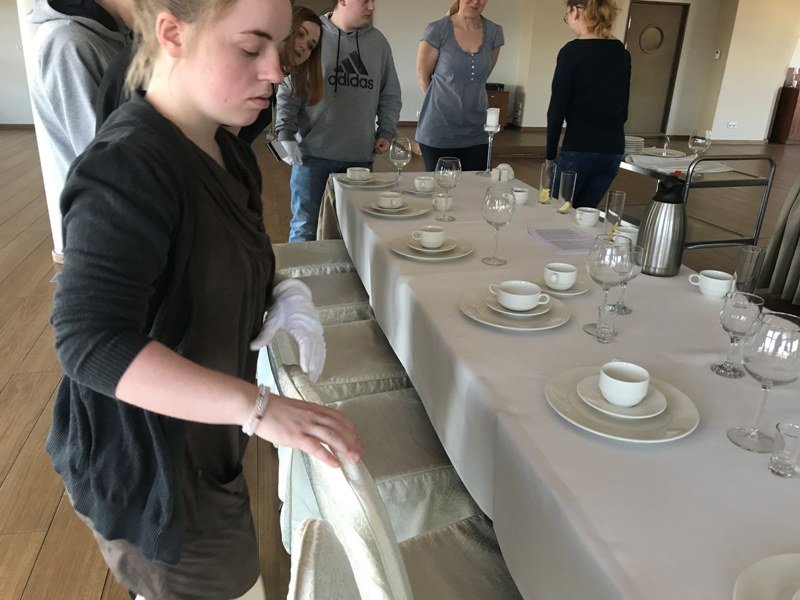 Zaczynając od głuchego telefonu z uśmiechem na twarzy zaczęliśmy ćwiczenia. Młodzież poznała zasady nakrywania stołu na przyjęcia okolicznościowe np. wesela, komunie, urodziny oraz zasady obsługi gościa indywidualnego. Każdy sam musiał nakryć stół na przyjęcie zaczynając od talerza, podstawki, bulionówki, noża, widelca, widelczyka, łyżeczki, łyżki, gobletu, kieliszka do alkoholu itd. kończąc na bankietówce. Bankietówka, inaczej serweta konsumencka i jej wymyślne kształty można było zaobserwować na stole podczas zajęć. Spotkanie zakończyło się wspólnym zdjęciem zadowolonej, uśmiechniętej młodzieży wraz z opiekunami panią Angeliką Matuszczak i Dagmarą Maciejewską.