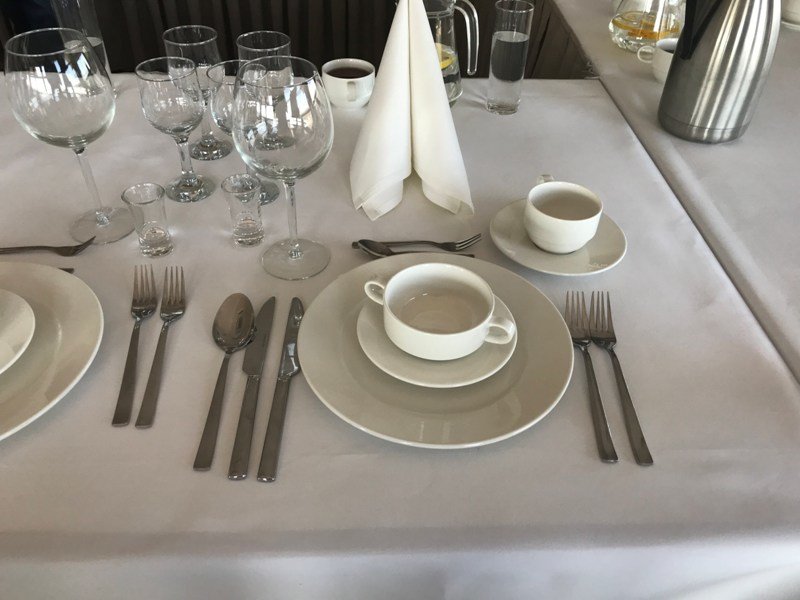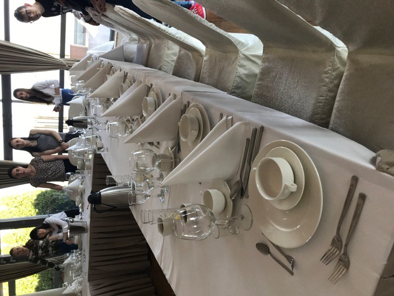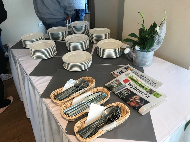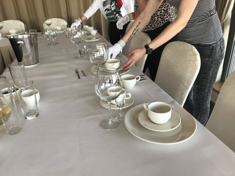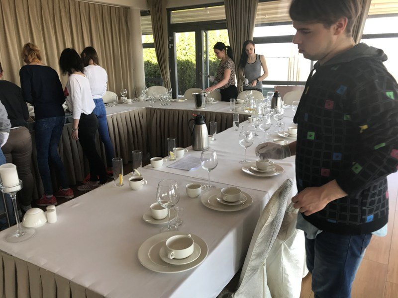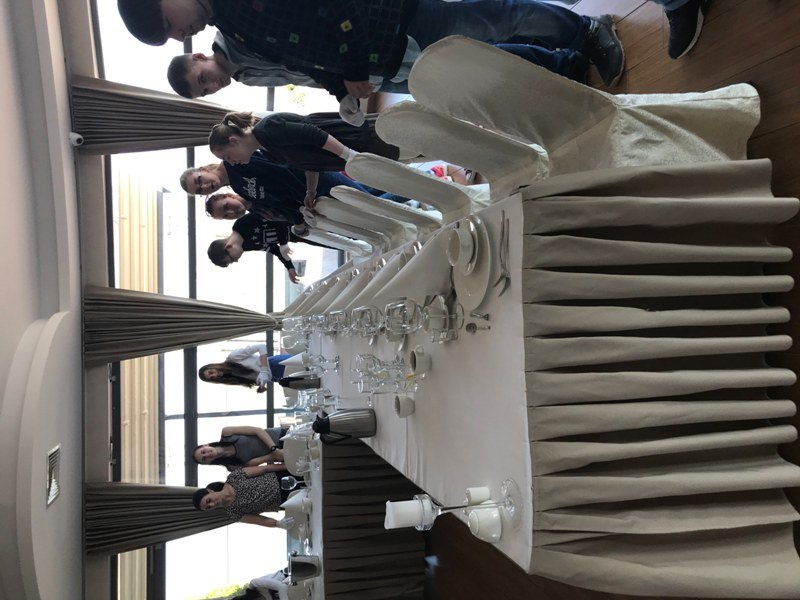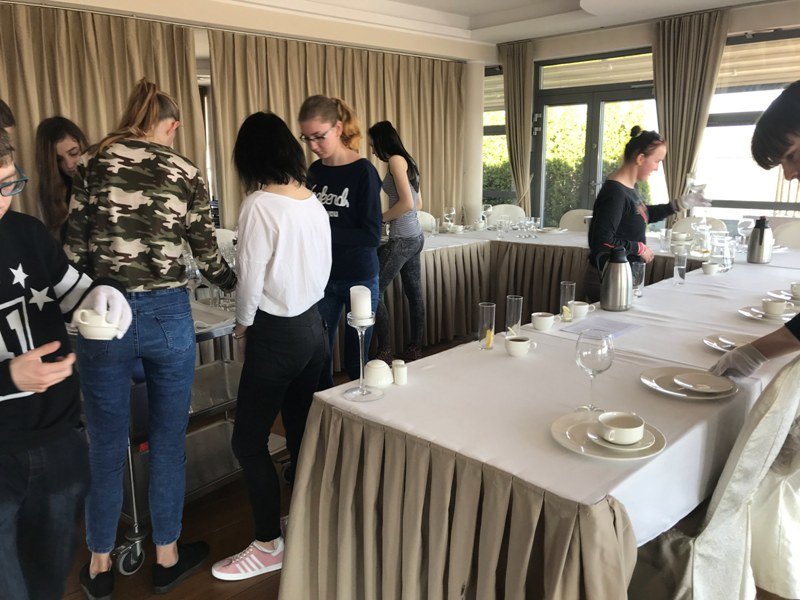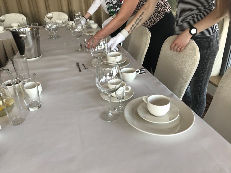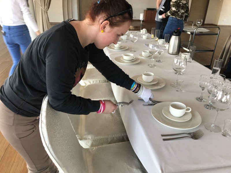 Zaczynając od głuchego telefonu z uśmiechem na twarzy zaczęliśmy ćwiczenia. Młodzież poznała zasady nakrywania stołu na przyjęcia okolicznościowe np. wesela, komunie, urodziny oraz zasady obsługi gościa indywidualnego. Każdy sam musiał nakryć stół na przyjęcie zaczynając od talerza, podstawki, bulionówki, noża, widelca, widelczyka, łyżeczki, łyżki, gobletu, kieliszka do alkoholu itd. kończąc na bankietówce. Bankietówka, inaczej serweta konsumencka i jej wymyślne kształty można było zaobserwować na stole podczas zajęć. Spotkanie zakończyło się wspólnym zdjęciem zadowolonej, uśmiechniętej młodzieży wraz z opiekunami panią Angeliką Matuszczak i Dagmarą Maciejewską.
