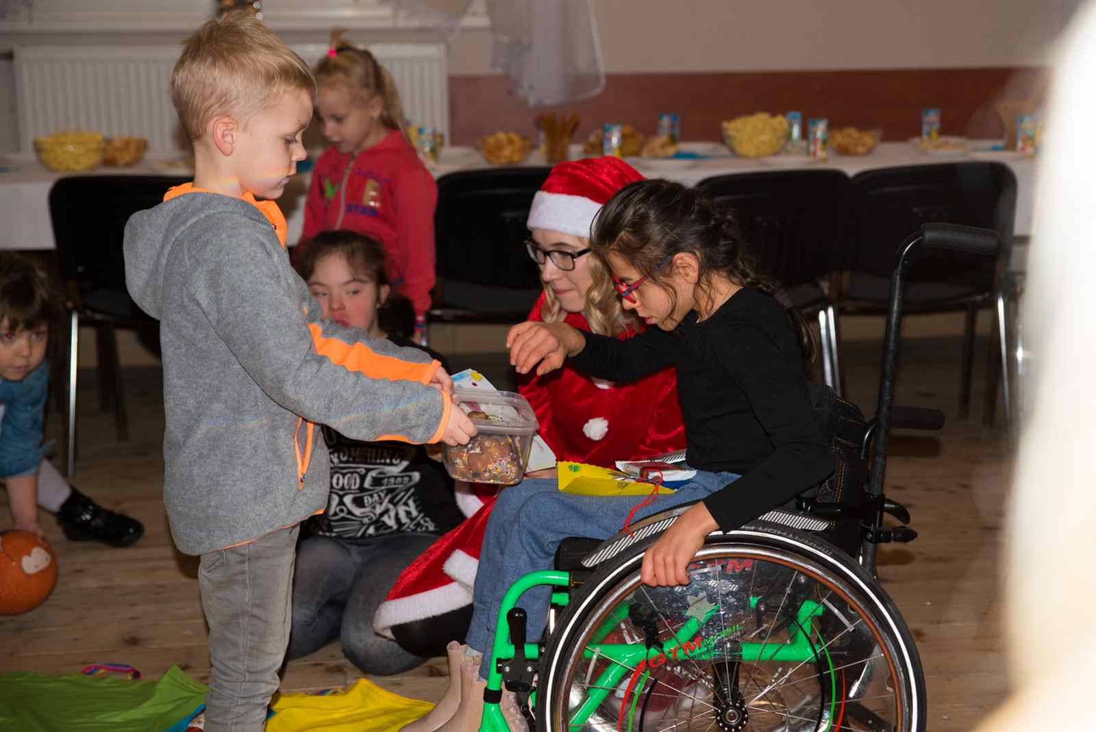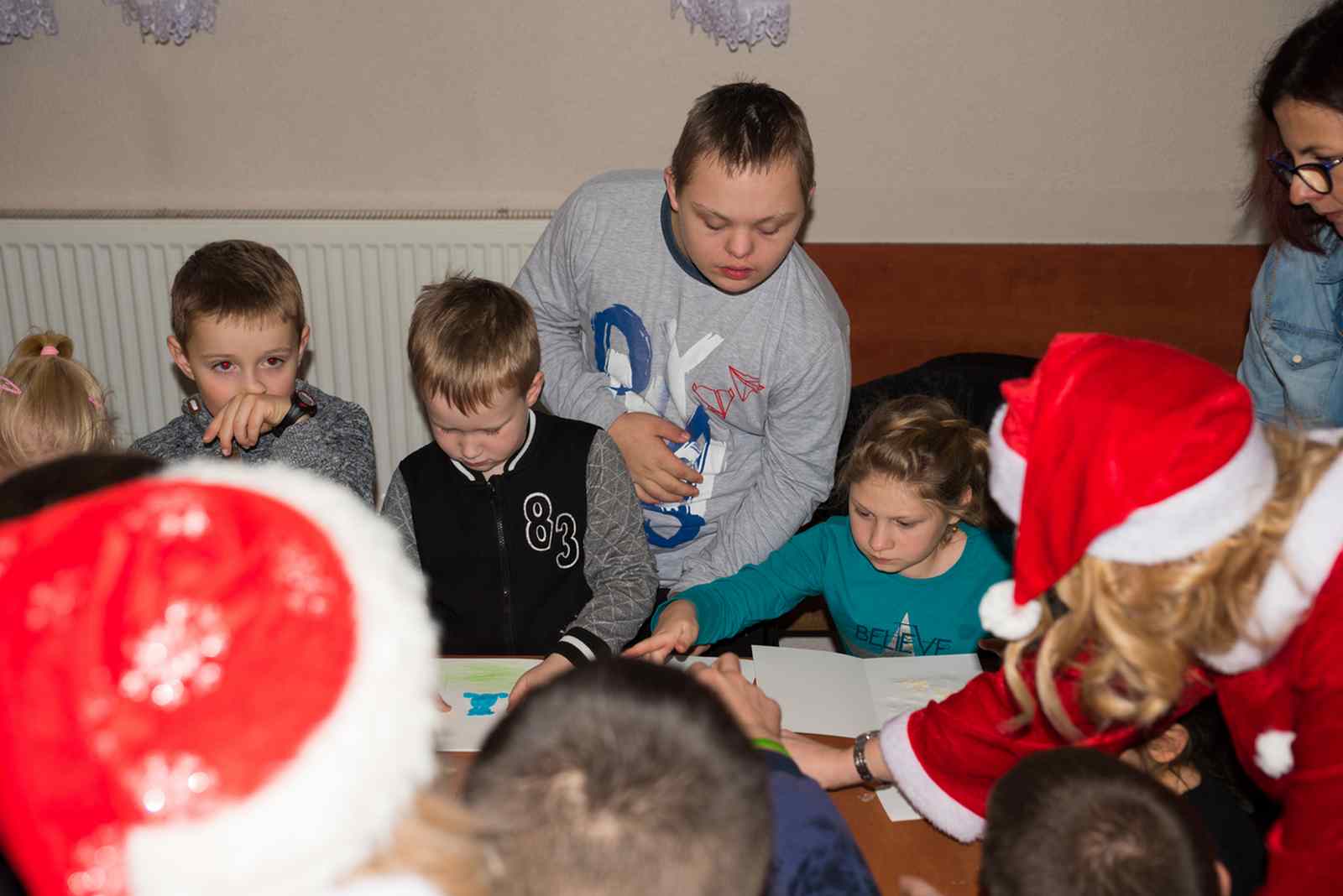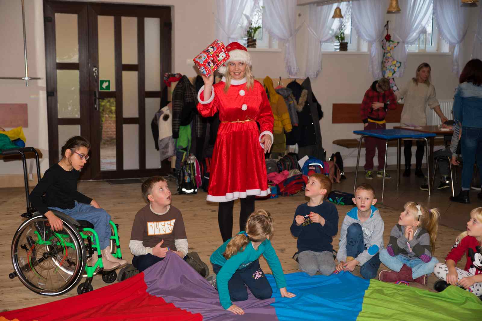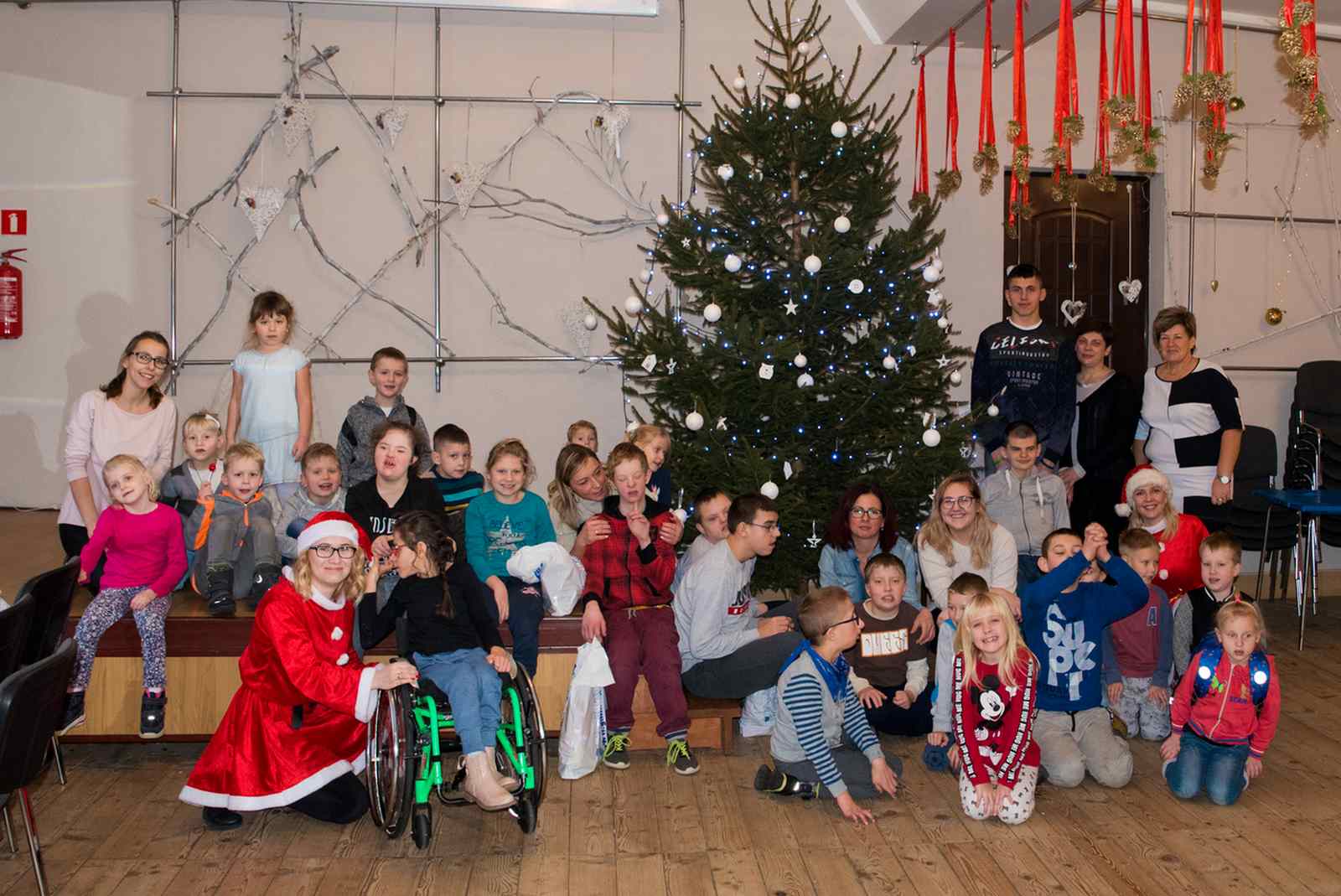 Jak co roku, tym razem 10 grudnia 2019r., nasi podopieczni z klasy II/IIIa oraz VII/VIIIa odwiedzili Wiejski Klub Kultury w Leśniewie gdzie spotkali się z wychowankami miejscowego przedszkola. Spotkanie rozpoczęliśmy od wspólnego przywitania się oraz wysłuchania opowiadania o „Brzydkim kaczątku”. Dużo radości sprawiły dzieciom, ale i dorosłym zabawy z wykorzystaniem chusty Klanzy oraz wspólne wykonywanie świątecznych kartek. Uczniowie otrzymali podarunki od wychowanków przedszkola, ale również od Mikołaja co uradowało naszych podopiecznych. Niespodzianką była też wata cukrowa, która wywołała duży uśmiech na twarzach dzieci. Spotkanie przebiegało w przemiłej świątecznej atmosferze, pełnej integracji i wzajemnej życzliwości.