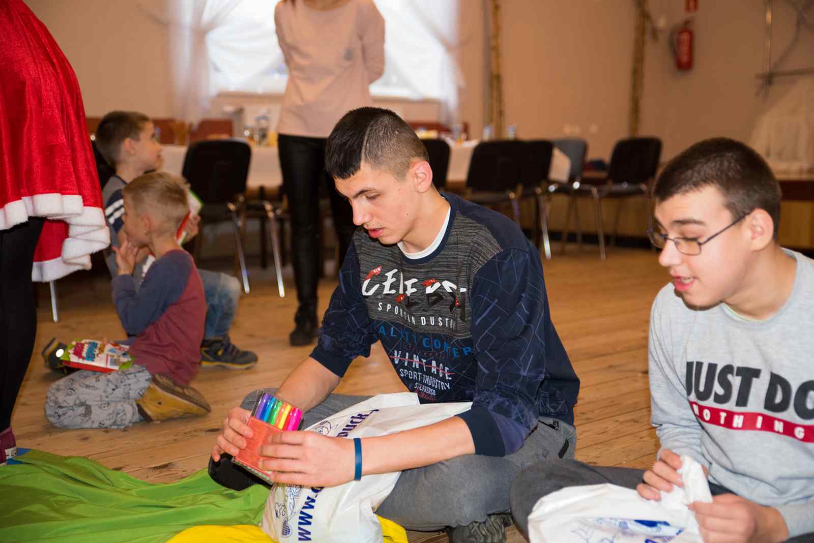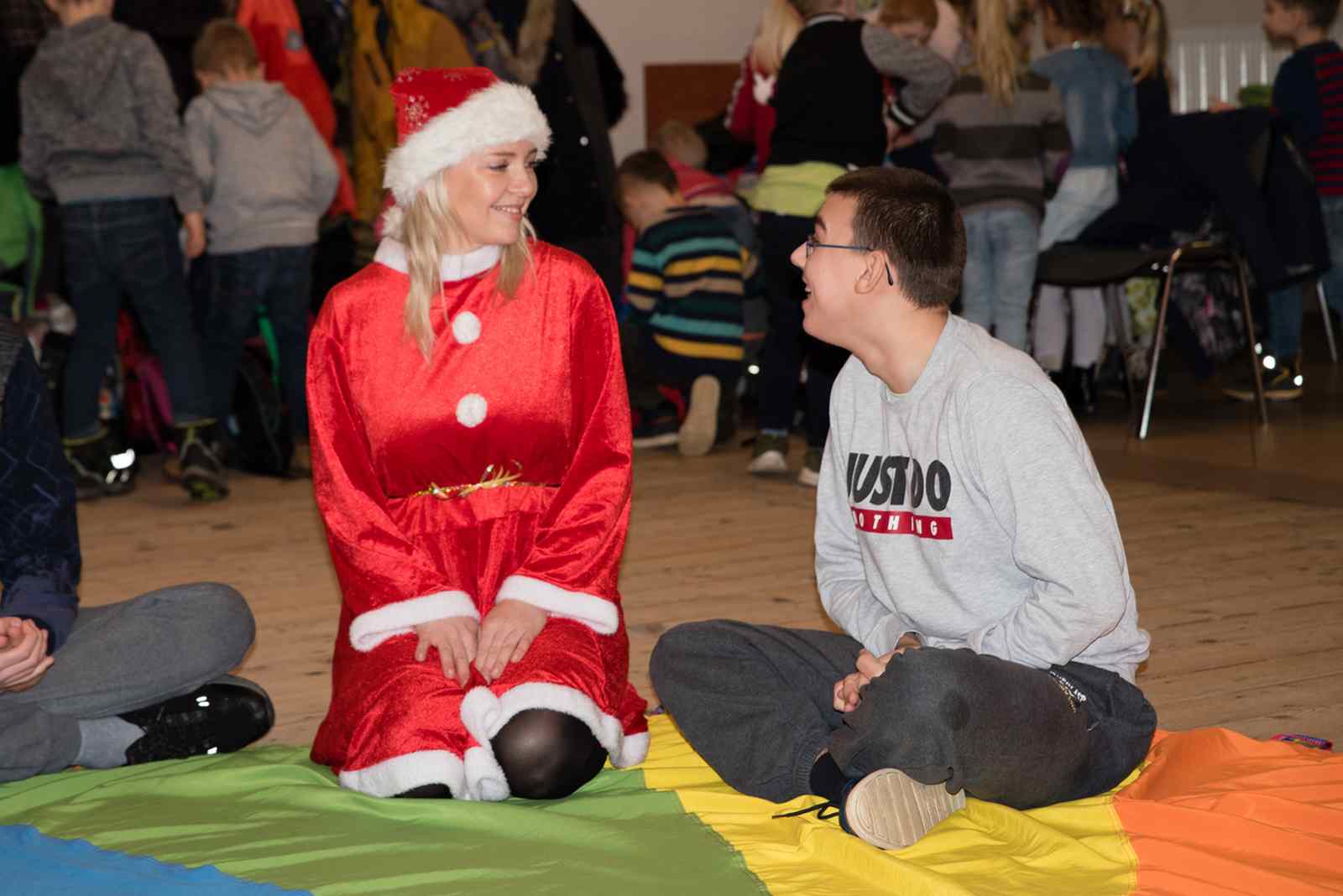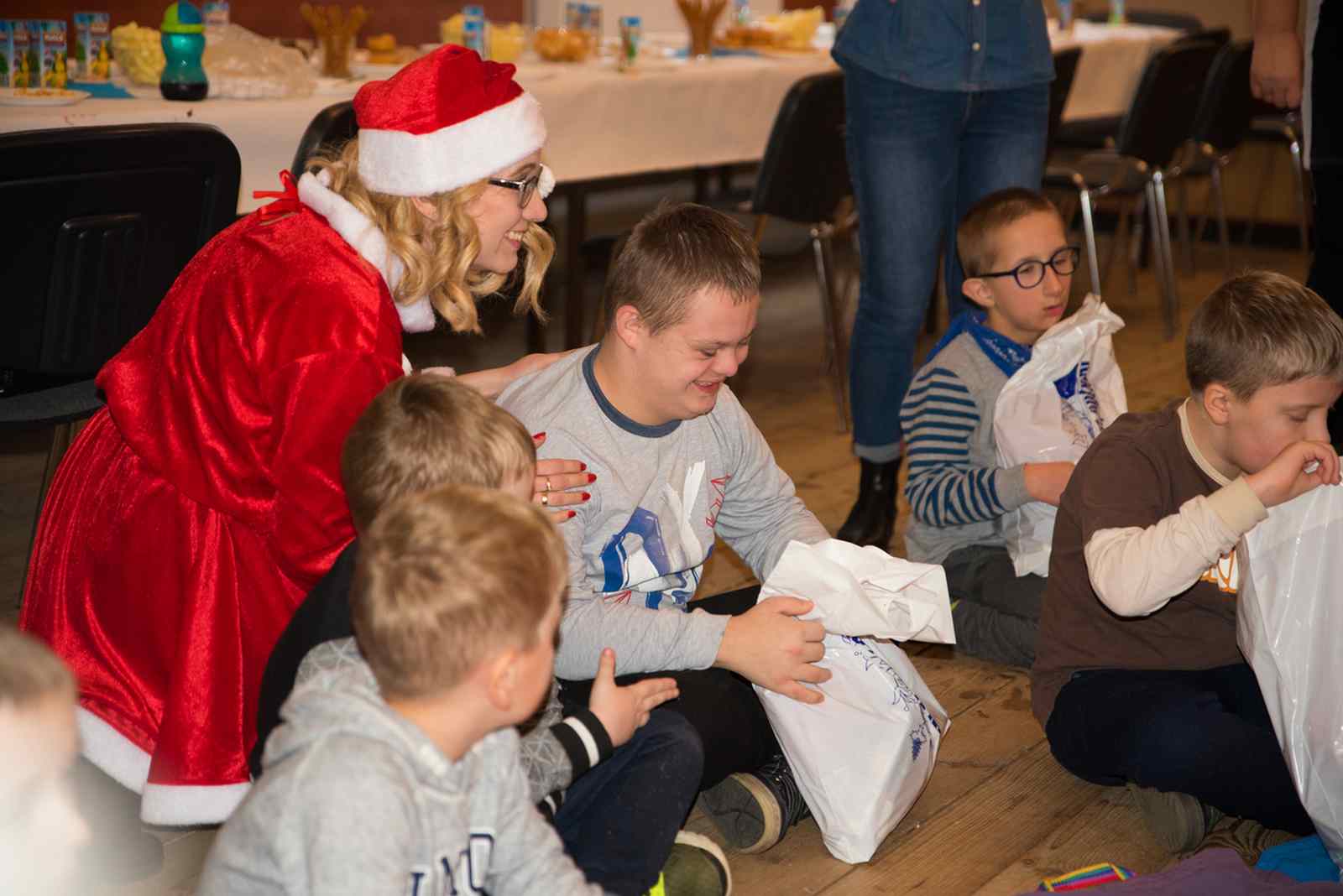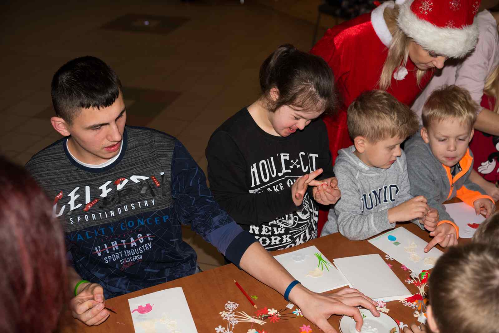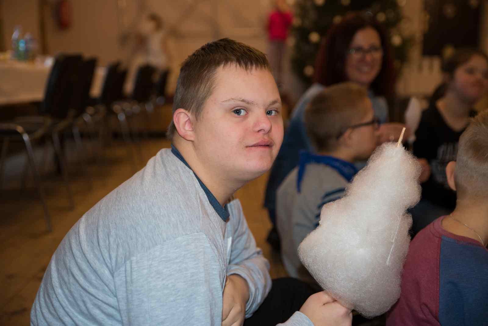 Jak co roku, tym razem 10 grudnia 2019r., nasi podopieczni z klasy II/IIIa oraz VII/VIIIa odwiedzili Wiejski Klub Kultury w Leśniewie gdzie spotkali się z wychowankami miejscowego przedszkola. Spotkanie rozpoczęliśmy od wspólnego przywitania się oraz wysłuchania opowiadania o „Brzydkim kaczątku”. Dużo radości sprawiły dzieciom, ale i dorosłym zabawy z wykorzystaniem chusty Klanzy oraz wspólne wykonywanie świątecznych kartek. Uczniowie otrzymali podarunki od wychowanków przedszkola, ale również od Mikołaja co uradowało naszych podopiecznych. Niespodzianką była też wata cukrowa, która wywołała duży uśmiech na twarzach dzieci. Spotkanie przebiegało w przemiłej świątecznej atmosferze, pełnej integracji i wzajemnej życzliwości.