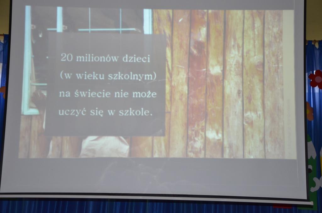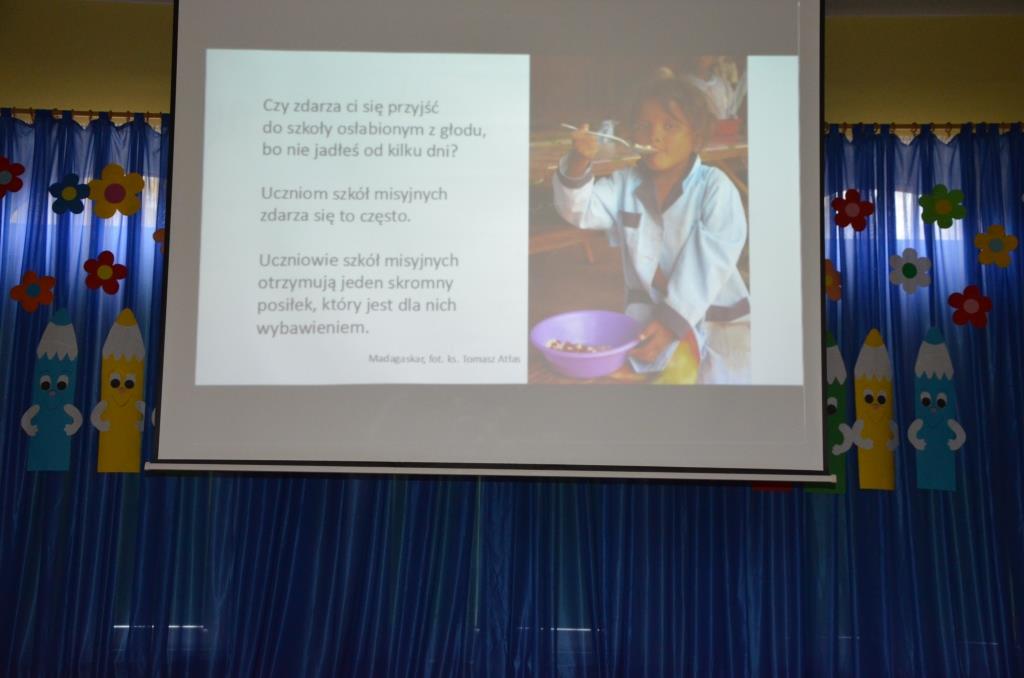 W piątek po Uroczystości Wszystkich Świętych, po Tygodniu misyjnym, udało mi się zebrać leniwych piżamowców w auli szkoły podstawowej na spotkanie informacyjne o „Adopcji na odległość”. Mieliśmy też gości i na tym spotkaniu aktywnie wzięli udział uczniowie klas SSPdP. Było nas dużo i spotkanie trwało 2 godziny lekcyjne! Starałam się, żebyście się nie nudzili! Gratuluję aktywnej pracy-był las rąk chętnych do odpowiedzi, gotowych do pracy, szeroko otwarte uszy i wesołe śpiewy, a nauczyciele wspaniale pomagali śpiewać!!! Nawet najmłodsi z zeróweczki mieli swój udział i nie tylko słuchali, ale na przerwie kolorowali obrazki do mapy świata. A wszystko po to, by wszyscy ZAPAMIĘTALI, że w miarę możliwości TRZEBA pomagać biedniejszym od nas. Mam nadzieję, że to spotkanie pokazało, że są na świecie dzieci, którym TRZEBA POMAGAĆ, bo mają trudniejsze życie od nas. Widzieliśmy to na filmie i slajdach o dzieciach z Afryki czy Madagaskaru. Nasza szkoła pomaga dzieciakom w KONGO. Misjonarze pomagają im zbudować szkołę, a my staramy się zbierać grosz do grosza, by potem wysłać im nasz dar, aby miały zeszyty do szkoły i nie były głodne. Misjonarze salezjanie przysłali nam długi list, którego część można przeczytać na planszy i obejrzeć zdjęcia. A my bierzemy się do DZIEŁA! Pamiętajcie, Kochani – LICZY SIĘ KAŻDY GROSZ!!!