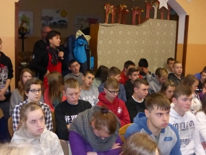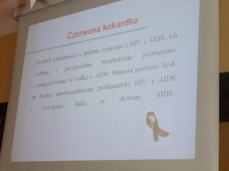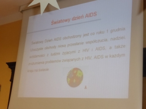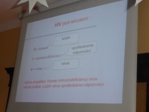 W części drugiej spotkania wyświetlono prezentację przygotowaną przez panią Marzenkę Kuczkowską, która w jasny i przejrzysty sposób wyjaśniła młodzieży czym jest HIV i choroba AIDS oraz jakie są fakty i mity krążące wokół tego tematu.