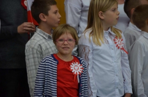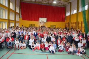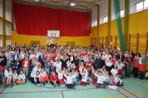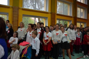 Wszyscy: uczniowie, nauczyciele oraz CAŁA SZKOLNA SPOŁECZNOŚĆ spotkaliśmy się w sali gimnastycznej w celu wspólnego odśpiewania czterech zwrotek Hymnu Narodowego. Dzięki punktualności i dobrej organizacji całość udała się bardzo dobrze i wszyscy z powagą i szacunkiem pięknie zaśpiewali, za co dziękujemy, BRAWO !!!