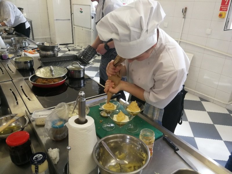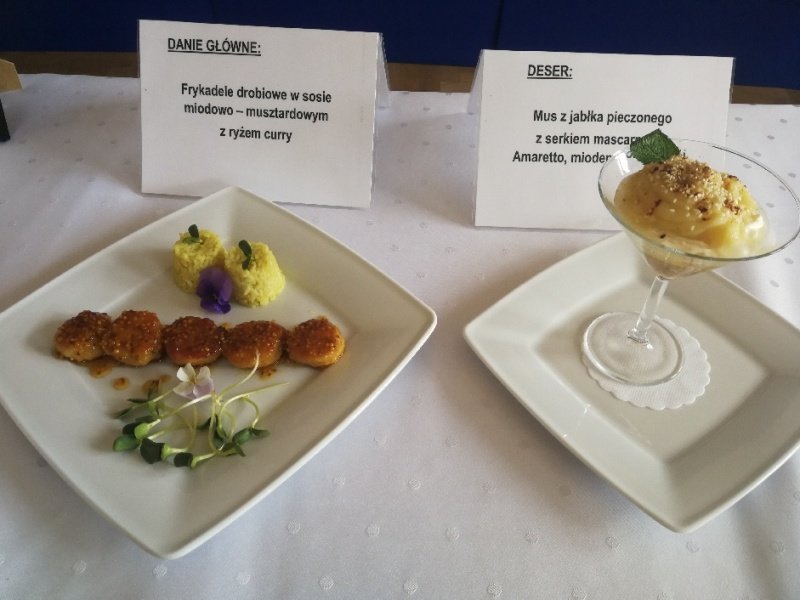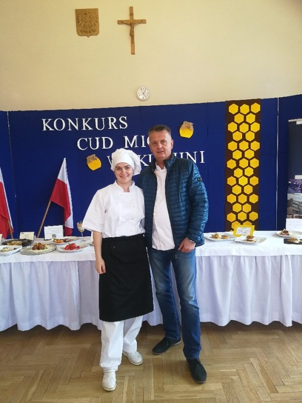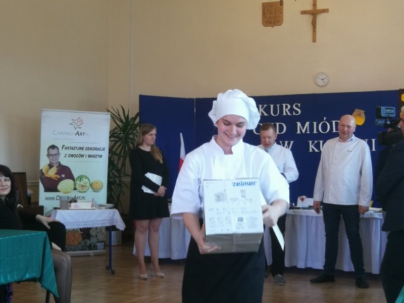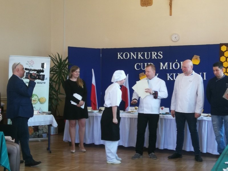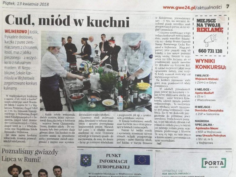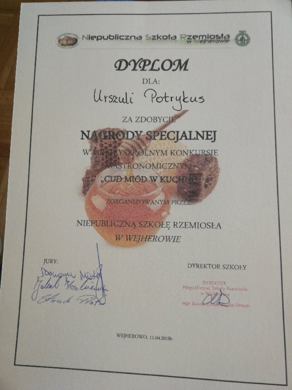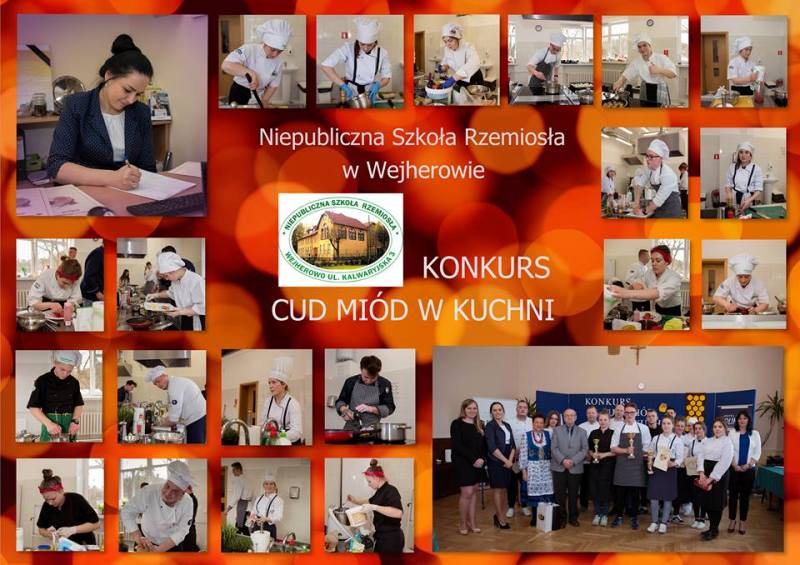 Odpowiedzieliśmy na zaproszenie Niepublicznej Szkoły Rzemiosła w Wejherowie i tak oto 11 kwietnia 2018 roku o godzinie 9.00 rozpoczęła się II edycja Międzyszkolnego Konkursu pod nazwą „Cud miód w kuchni”. Do konkursu przystąpiło 6 szkół : Niepubliczna Szkoła Rzemiosła z Wejherowa, Powiatowy Zespół Szkół nr 3 im. Ks. Edmunda Roszczynialskiego  z Wejherowa, Zespół Szkół Ponadgimnazjalnych z Somonina, Zespół Szkół Hotelarsko-Gastronomicznych z Gdyni, Zespół Szkół nr 1 z Władysławowa oraz My czyli Branżowa Szkoła I stopnia Nr 5 z dotychczasowymi oddziałami ZSZ nr 5 w Wejherowie. Łącznie rywalizowało 11 uczestników, którzy oceniani byli indywidualnie za wykonanie potrawy. Każdy przygotowywał danie główne oraz deser, który miał zawierać w swoim składzie naturalny miód pszczeli. Naszą szkołę reprezentowała uczennica klasy 2b Urszula Potrykus. Przygotowania do konkursu trwały od dwóch tygodni pod czujnym okiem szefa kuchni Waldemara Góreckiego i Urszuli Treder. Prace młodych kucharzy oceniali:  Sławomir Miotk – Stary Browar Kościerzyna , Jakub Kozakiewicz – Dwór Polender,  Piotr Struck. Jury miało trudne decyzje do podjęcia, gdyż uczniowie zaprezentowali swoje dania główne i desery na wysokim poziomie. Pierwsze miejsce wywalczył Wojciech Niziński z Zespołu Szkół Hotelarsko- Gastronomicznych z Gdyni, drugie miejsce Agata Mudlaff  z Zespołu Szkół nr 1 z Władysławowa oraz trzecie miejsce Dominika Cieszyńska z Zespół Szkół Ponadgimnazjalnych w Somoninie. Do czołówki również dołączyli Agnieszka Meyer z Niepublicznej Szkoły Rzemiosła Wejherowo oraz Urszula Potrykus z Branżowej Szkoły I stopnia Nr 5 z Wejherowa, które otrzymały NAGRODĘ SPECJALNĄ w postaci sprzętu kuchennego. Nasza uczennica przetarła szlaki dla kolejnych śmiałków rywalizując z tak liczną reprezentacją innych szkół gdzie uczniowie odbywają praktyki w renomowanych restauracjach. Jesteśmy bardzo dumni z udziału Naszej uczennicy w tak prestiżowym konkursie, ponieważ jest to odwaga przygotować potrawę, która niczym nie odbiega od zamieszczonych w kartach menu restauracyjnych i hotelowych.Przepis Naszej uczennicy, który swoim smakiem i wyglądem oczarował jury to Frykadele drobiowe w sosie miodowo – musztardowym oraz Mus z jabłka pieczonego z serkiem mascarpone i amatetto. Liczymy na to, iż w przyszłorocznej edycji nasi uczniowie również wykażą się swoimi wysokimi umiejętnościami kulinarnymi, co utwierdzi ich w przekonaniu, że z powodzeniem mogą stanąć w szranki z innymi uczniami z innych szkół gastronomicznych.