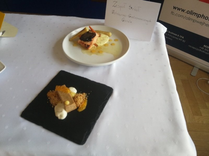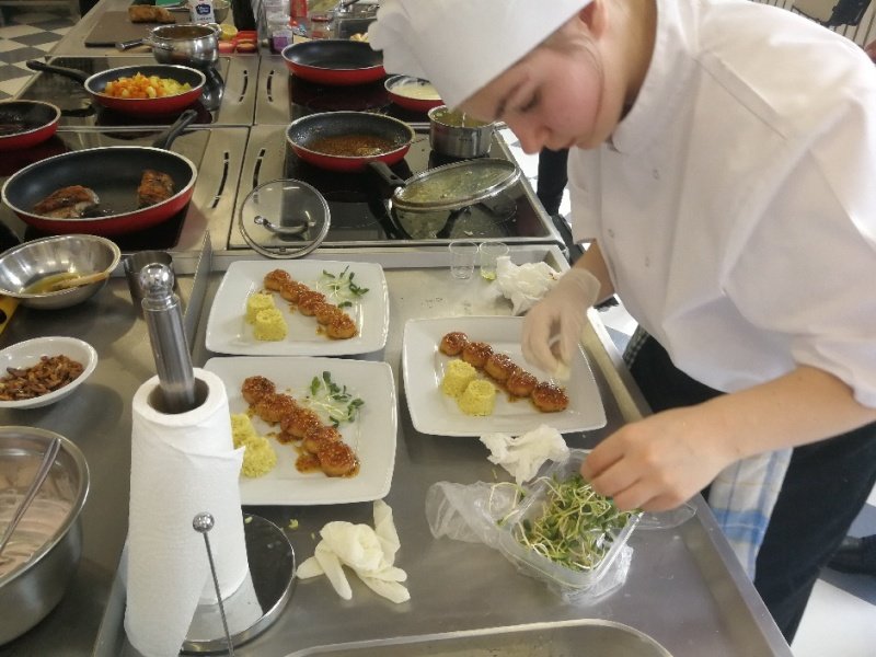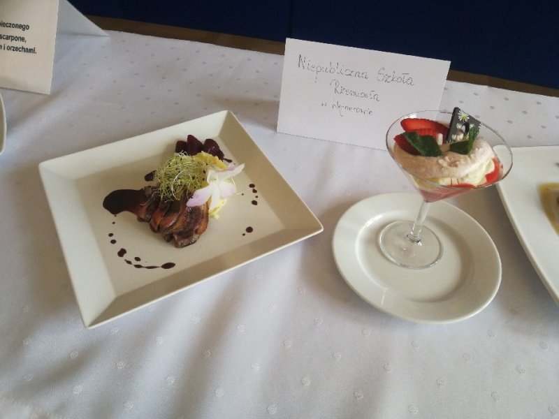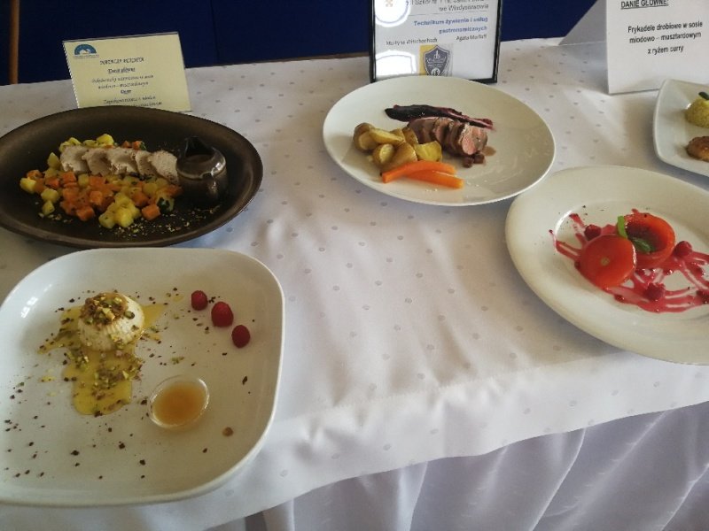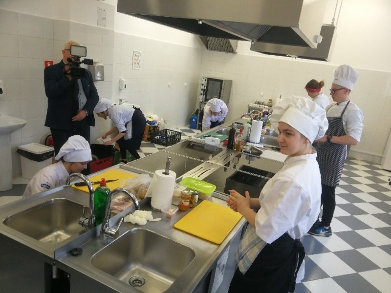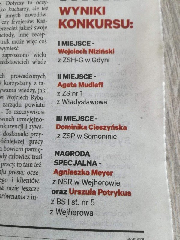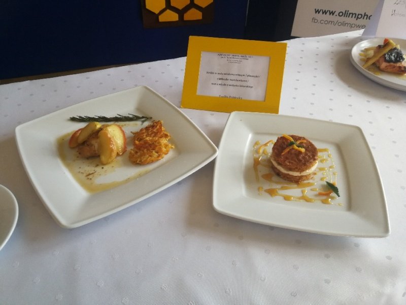 Odpowiedzieliśmy na zaproszenie Niepublicznej Szkoły Rzemiosła w Wejherowie i tak oto 11 kwietnia 2018 roku o godzinie 9.00 rozpoczęła się II edycja Międzyszkolnego Konkursu pod nazwą „Cud miód w kuchni”. Do konkursu przystąpiło 6 szkół : Niepubliczna Szkoła Rzemiosła z Wejherowa, Powiatowy Zespół Szkół nr 3 im. Ks. Edmunda Roszczynialskiego  z Wejherowa, Zespół Szkół Ponadgimnazjalnych z Somonina, Zespół Szkół Hotelarsko-Gastronomicznych z Gdyni, Zespół Szkół nr 1 z Władysławowa oraz My czyli Branżowa Szkoła I stopnia Nr 5 z dotychczasowymi oddziałami ZSZ nr 5 w Wejherowie. Łącznie rywalizowało 11 uczestników, którzy oceniani byli indywidualnie za wykonanie potrawy. Każdy przygotowywał danie główne oraz deser, który miał zawierać w swoim składzie naturalny miód pszczeli. Naszą szkołę reprezentowała uczennica klasy 2b Urszula Potrykus. Przygotowania do konkursu trwały od dwóch tygodni pod czujnym okiem szefa kuchni Waldemara Góreckiego i Urszuli Treder. Prace młodych kucharzy oceniali:  Sławomir Miotk – Stary Browar Kościerzyna , Jakub Kozakiewicz – Dwór Polender,  Piotr Struck. Jury miało trudne decyzje do podjęcia, gdyż uczniowie zaprezentowali swoje dania główne i desery na wysokim poziomie. Pierwsze miejsce wywalczył Wojciech Niziński z Zespołu Szkół Hotelarsko- Gastronomicznych z Gdyni, drugie miejsce Agata Mudlaff  z Zespołu Szkół nr 1 z Władysławowa oraz trzecie miejsce Dominika Cieszyńska z Zespół Szkół Ponadgimnazjalnych w Somoninie. Do czołówki również dołączyli Agnieszka Meyer z Niepublicznej Szkoły Rzemiosła Wejherowo oraz Urszula Potrykus z Branżowej Szkoły I stopnia Nr 5 z Wejherowa, które otrzymały NAGRODĘ SPECJALNĄ w postaci sprzętu kuchennego. Nasza uczennica przetarła szlaki dla kolejnych śmiałków rywalizując z tak liczną reprezentacją innych szkół gdzie uczniowie odbywają praktyki w renomowanych restauracjach. Jesteśmy bardzo dumni z udziału Naszej uczennicy w tak prestiżowym konkursie, ponieważ jest to odwaga przygotować potrawę, która niczym nie odbiega od zamieszczonych w kartach menu restauracyjnych i hotelowych.Przepis Naszej uczennicy, który swoim smakiem i wyglądem oczarował jury to Frykadele drobiowe w sosie miodowo – musztardowym oraz Mus z jabłka pieczonego z serkiem mascarpone i amatetto. Liczymy na to, iż w przyszłorocznej edycji nasi uczniowie również wykażą się swoimi wysokimi umiejętnościami kulinarnymi, co utwierdzi ich w przekonaniu, że z powodzeniem mogą stanąć w szranki z innymi uczniami z innych szkół gastronomicznych.
