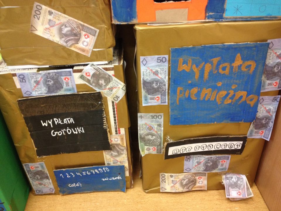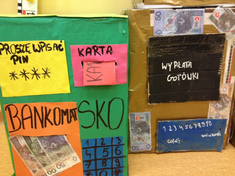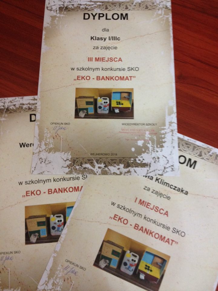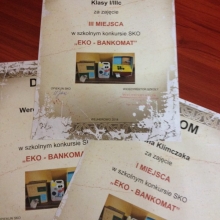 Z ogromną niecierpliwością nasi uczniowie czekali na ogłoszenie wyników konkursu SKO pt. „Eko-bankomat”. Zadaniem było wykonanie ekologicznego bankomatu tzn. z materiałów tj. kartony, nakrętki, bibułę itp. Komisja konkursowa miała ogromny problem z przyznaniem miejsc. Każda praca była bardzo pomysłowa i wspaniale wykonana. Większość bankomatów przypominała wyglądem te prawdziwe:). Uczniowie dopracowali każdy szczegół. Na uwagę zasługują szufladki, które wydają banknoty.