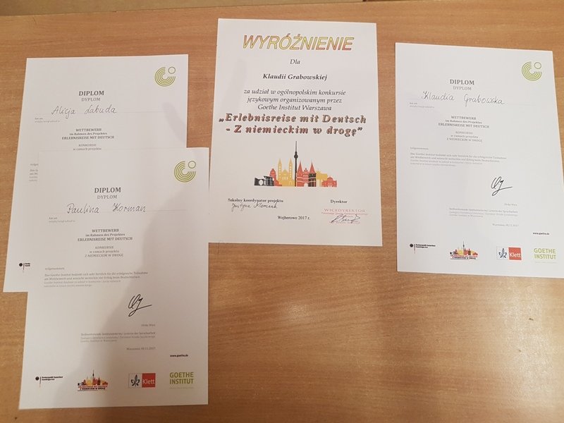 „Erlebnisreise mit Deutsch / Z niemieckim w drogę” to projekt realizowany przez Goethe-Institut we współpracy z wydawnictem LektorKlett. Uczennice klas gimnazjalnych IIa oraz IIb – Klaudia, Grabowaka, Paulina Korman oraz Alicja Labuda przystąpiły do owego projektu. Zadaniem zespołu było przygotowanie pocztówki z wakacji. W teksie musiały znaleźć się cztery słówka z listy słownictwa przesłanego przez Goethe Institut Warszawa.