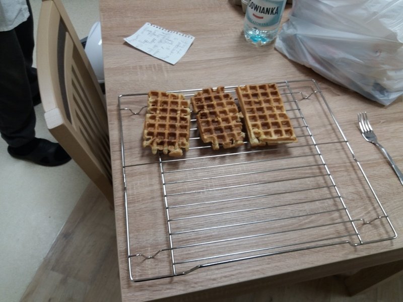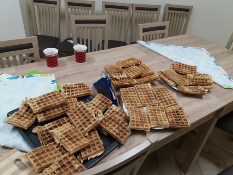 W tym tygodniu odbyło się wielkie pieczenie gofrów. Do pracy zabraliśmy się zaraz po obiedzie. Rozpoczęliśmy od przygotowania produktów. Przygotowaliśmy dużą miskę ciasta. Następnie, kiedy gofrownica była już odpowiednio nagrzana przystąpiliśmy do pieczenia. Wszędzie unosił się wspaniały aromat pieczonego ciasta. Wszystkie wyglądały apetycznie a smakowały jeszcze lepiej. Gofry były tak pyszne, że co niektórzy skorzystali z dokładki.