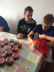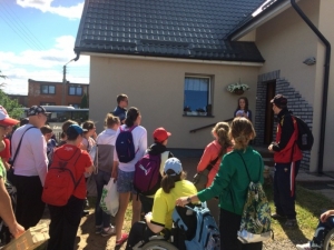 Kiedy wsiedliśmy do autokaru pod szkołą, zostaliśmy pożegnani przez panią Dyrektor Małgorzatę Woźniak, która życzyła nam obfitych truskawkowych zbiorów. Na miejscu w Łapalicach już przy wjeździe do gospodarstwa, czekała na nas gospodyni pani Marzena Dejk. Zostaliśmy bardzo serdecznie przywitani, zaproszeni do domu gdzie mogliśmy się posilić po podróży. Następnie zostaliśmy podzieleni na dwie grupy. Jedna wybrała się z gospodarzem panem Adamem aby zobaczyć jak wygląda chlewnia, licząca 300 sztuk trzody. Mogliśmy wziąć na ręce małe trzytygodniowe prosiaczki. Następnie poszliśmy na łąkę gdzie narwaliśmy trawy i koniczyny, którą mogliśmy nakarmić kozy, konia w Mini ZOO. Zobaczyliśmy bażanta złocistego, kury ozdobne, gołębie pocztowe, pawia, króliki, świnki morskie, koszatniczki i wiele innych zwierząt. Druga grupa w tym czasie obierała i kroiła świeże, kaszubskie truskawki by przygotować z nich pachnące konfitury. Obie ekipy, które przygotowywały konfitury pracowały zgodnie, sprawnie, w miłej atmosferze. Wszyscy uczniowie, nauczyciele i opiekunowie byli zachwyceni dobrą energią jaka płynęła od gospodarzy, uśmiechem i sercem na dłoni. Koniecznie chcemy wrócić do gospodarstwa jesienią.