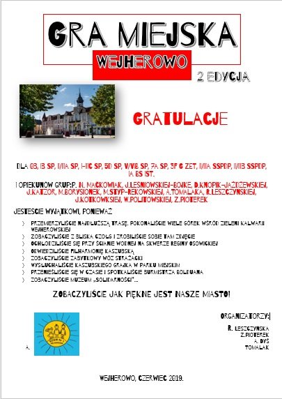 W tym roku w grze miejskiej udział wzięło 11 zespołów począwszy od oddziału przedszkolnego aż po szkołę branżową. Zadaniem drużyn było wybranie co najmniej dwóch spośród kilkunastu atrakcji naszego miasta, a następnie wykonanie zdjęcia pamiątkowego. Dodatkowo każda drużyna była zobowiązana przygotować „sprawozdanie” z podróży po Wejherowie.