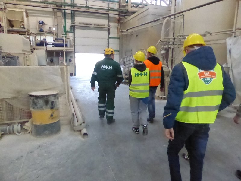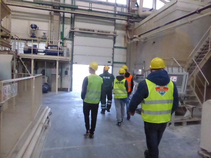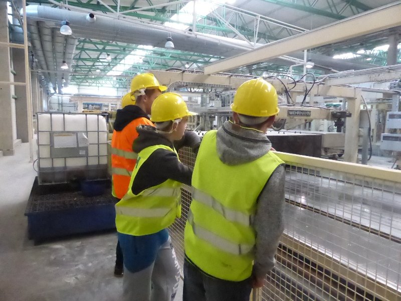 Uczniowie wizytę rozpoczęli od krótkiego szkolenia BHP przeprowadzonego przez pracownika zakładu. Następnie pan technolog Jacek Janowski przybliżył historię firmy, jej dokonania i obecny stan produkcji. Nasi przyszli murarze rozpoczęli zwiedzanie zakładu od hali wstępnej produkcji, w której w ogromnych zbiornikach magazynuje się i przygotowuje komponenty materiałów. Z ciekawością zapoznawali się z etapami przygotowania odrębnych składników po sporządzanie gotowych modułów. Udali się również do zautomatyzowanej hali produkcyjnej, w której następowały poszczególne frakcje odlewu wyrobu, poprzez wszystkie fazy obróbki aż do gotowych elementów w tym wypadku bloczków betonu komórkowego. Uczniowie z ciekawością słuchali oraz zadawali pytania. Wycieczka bardzo podobała się wszystkim jej uczestnikom.