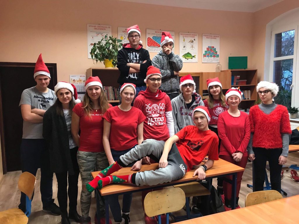 Samorząd Uczniowski ogłosił konkurs dla klas VII,VIII oraz BSIS na najbardziej czerwoną klasę w szkole w dniu 6 grudnia;). Punktowany był każdy element stroju, w którym dominuje kolor czerwony oraz posiadający element świąteczny. W czwartek na trzeciej i czwartej godzinie lekcyjnej przedstawiciele Samorządu zliczali punkty w każdej klasie. I miejsce zajęła klasa 1b BSIs. Pomimo tego, że nie wszyscy mogli być zwycięzcami, to cała szkoła bardzo dobrze się bawiła i można było poczuć świąteczną atmosferę.