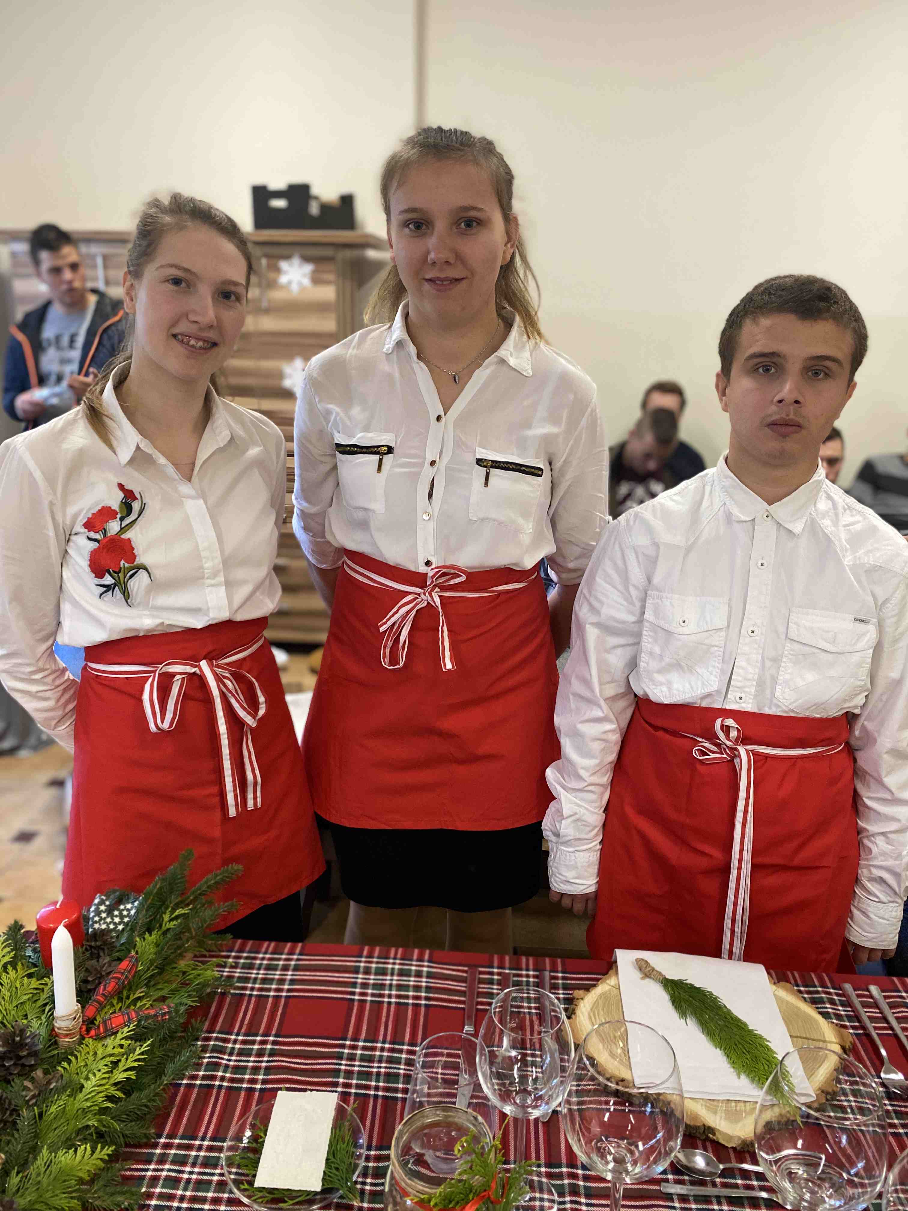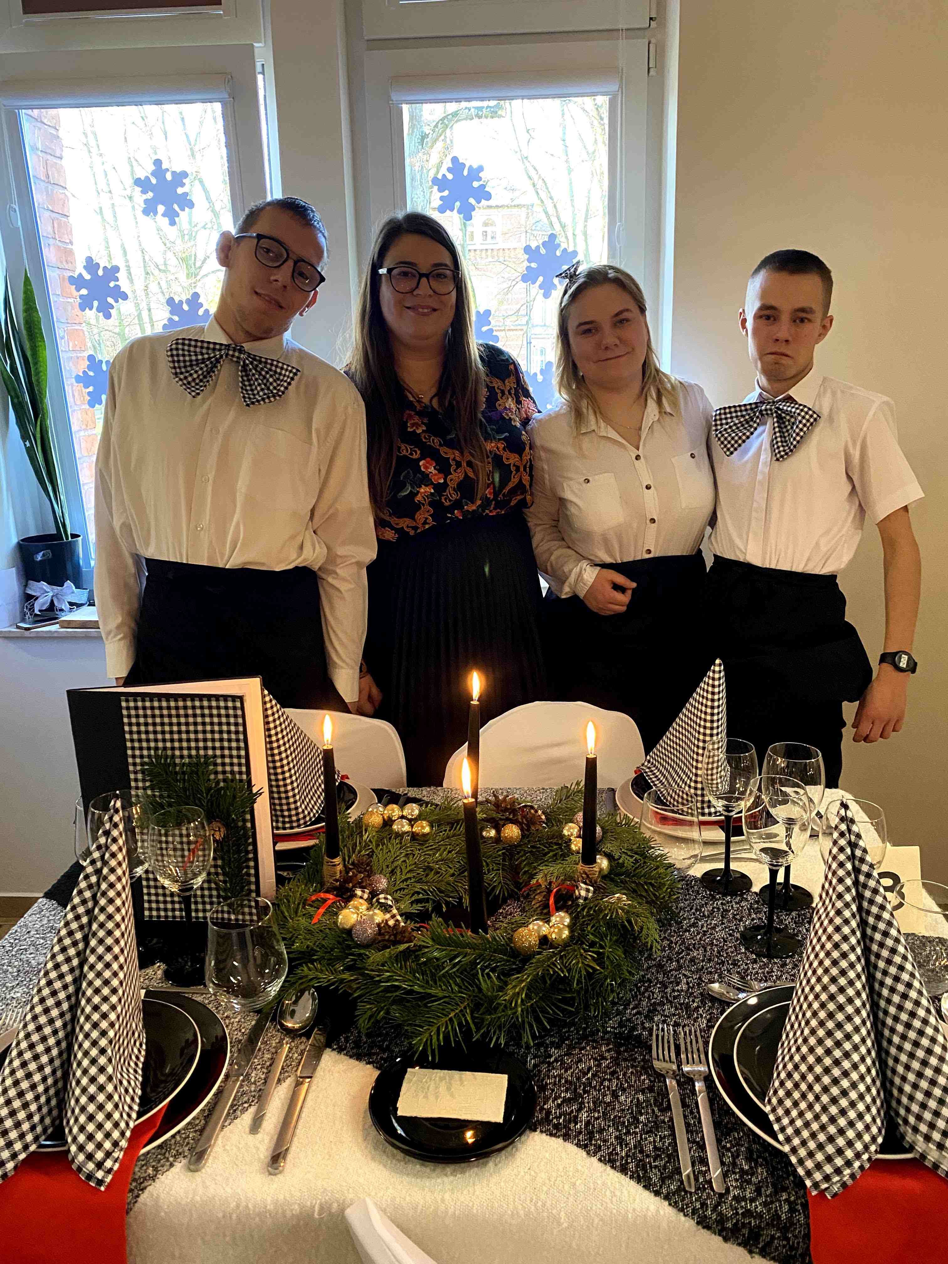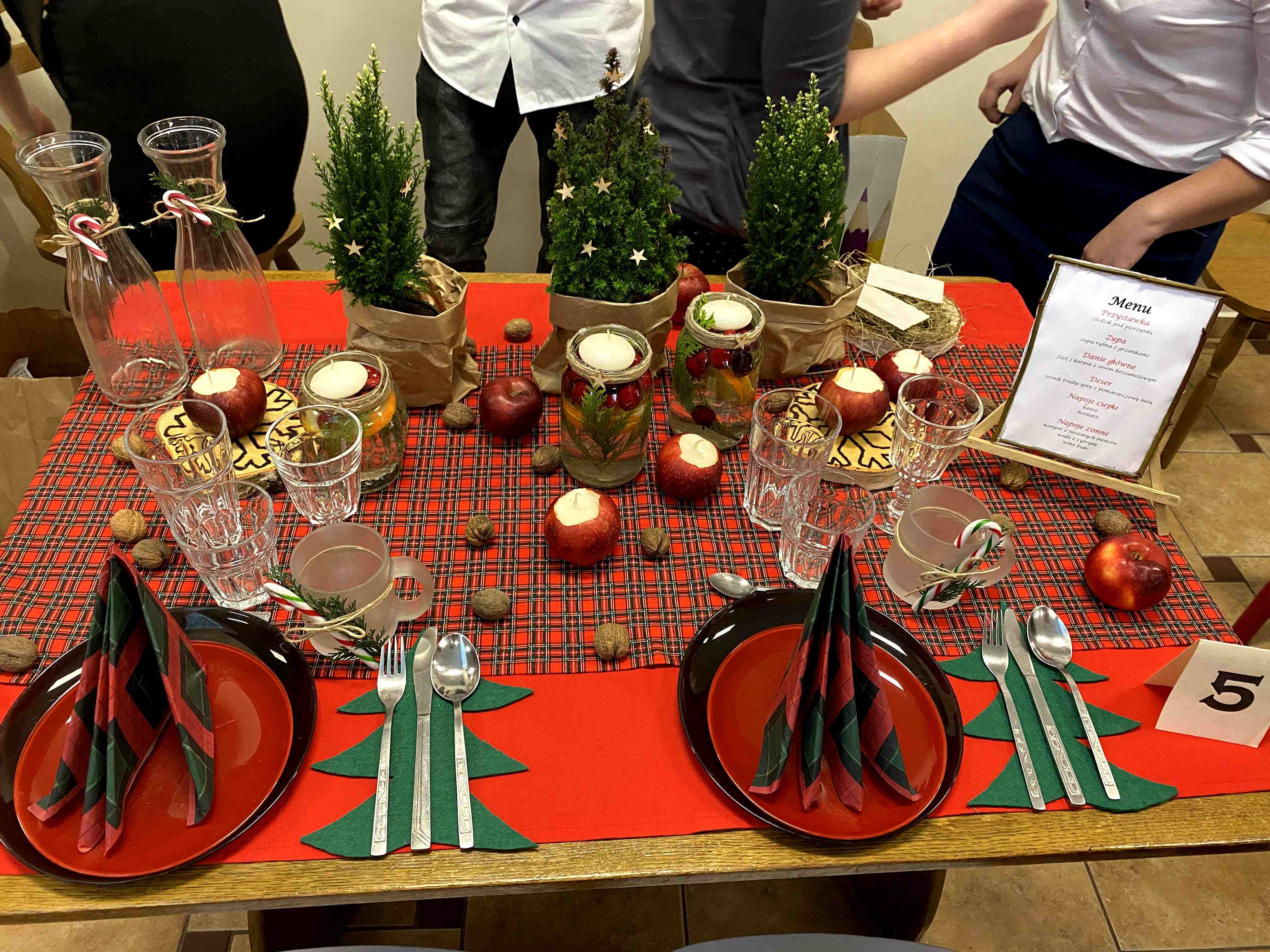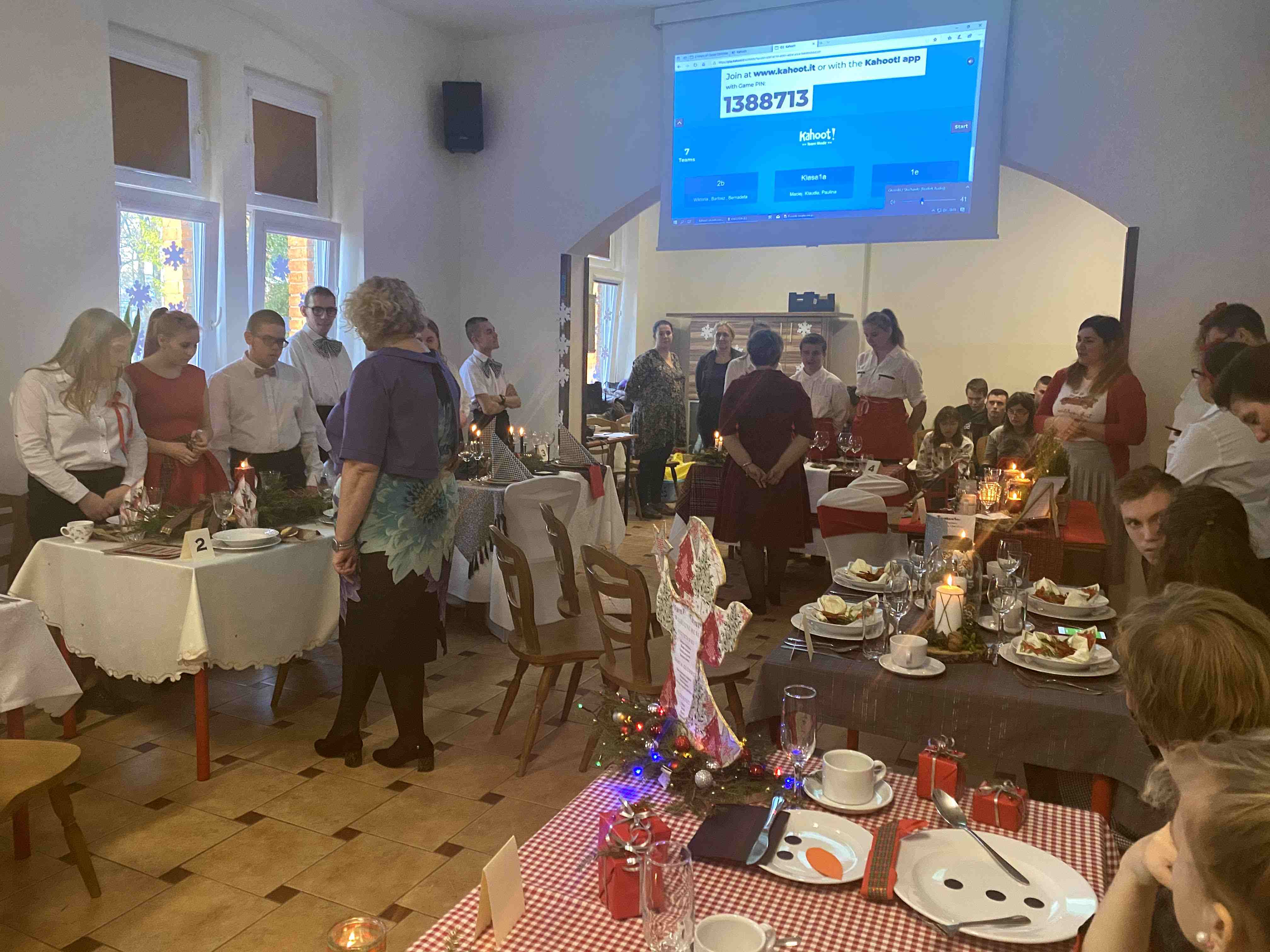 W świątecznej atmosferze uczniowie klas kucharskich i hotelarskich rywalizowali ze sobą w szkolnym konkursie na dekorację stołu. Ich zadaniem było zaaranżowanie stołu na wigilijną wieczerzę „Świąteczną kratą nastrój narysujmy…”