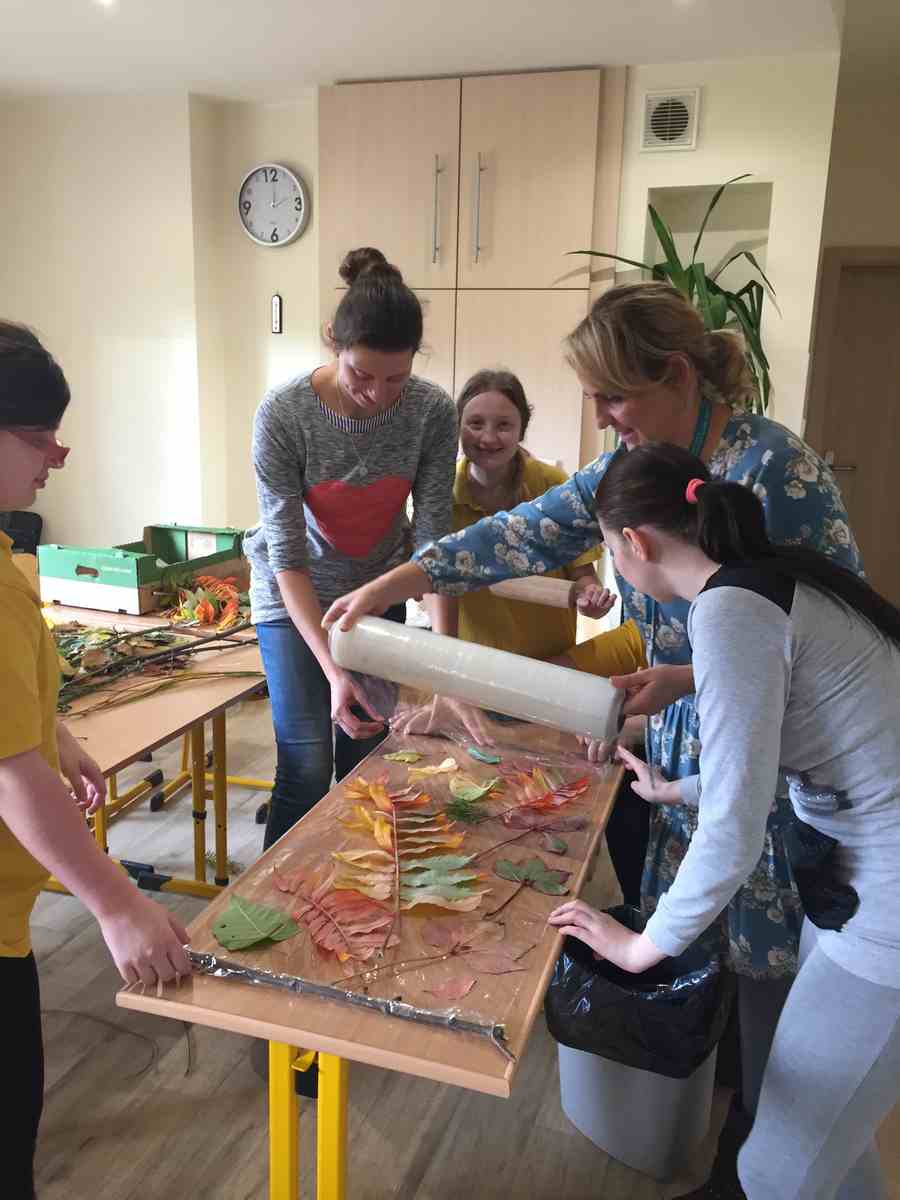 W ramach zajęć integracyjnych uczniów klas pierwszych i drugich BSIst zorganizowałyśmy wspólne lekcje tworzenia JESIENNYCH WITRAŻY. Naturalne materiały na wykonanie prac dostarczyła nam nasza polska złota jesień. Zajęcia wymagały współpracy wszystkich uczniów, by uzyskać pożądany efekt końcowy. Uczniowie z zaangażowaniem podjęli się wyzwania, odnosili się do siebie z szacunkiem, a co najważniejsze wspólnie podejmowali decyzje w trakcie tworzenia prac. Podczas zajęć panowała miła i wesoła atmosfera, która udzielała się wszystkim i została z nami do końca dnia.