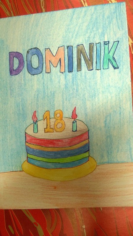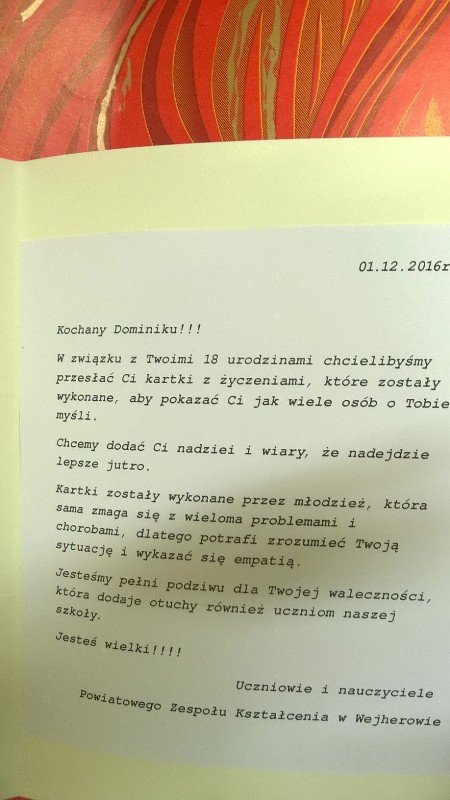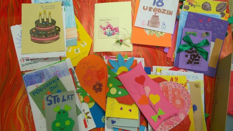 Uczniowie naszej szkoły zaangażowali się w akcję „Kartka dla Dominika”. Wraz z nauczycielami wykonali dużą ilość kartek urodzinowych dla chłopca chorego na raka, z okazji Jego 18 urodzin. Życzenia zostały wysłane do domu Dominika. Mamy nadzieję,że dzięki nim chociaż na chwilę chłopiec będzie mógł zapomnieć o bólu i cieszyć się, że ma tak wielkie wsparcie.