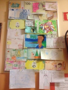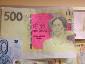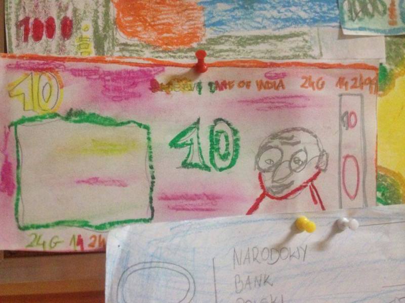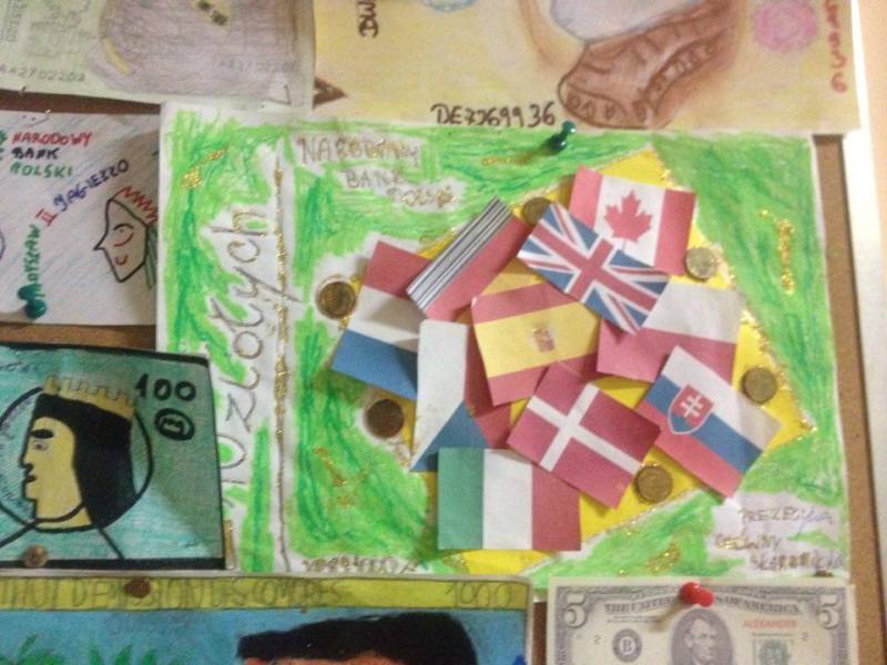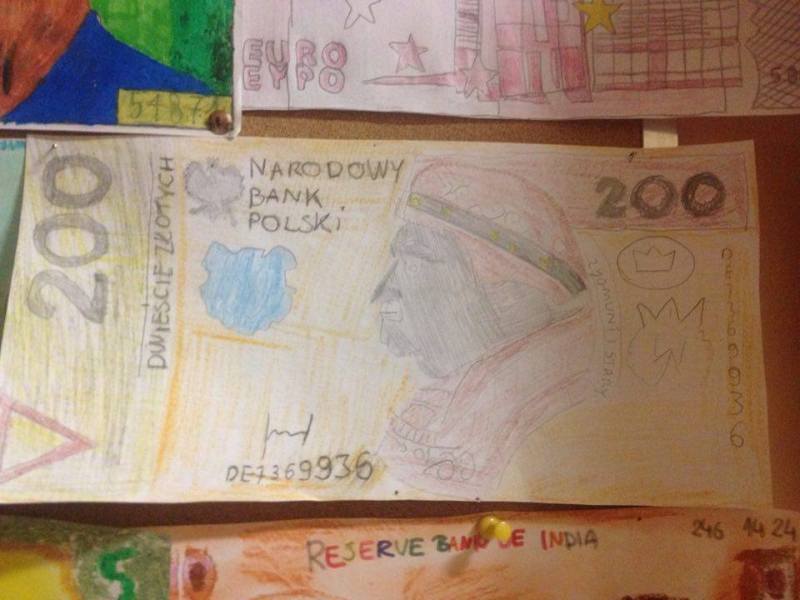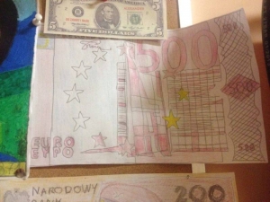 „Banknot dowolnego kraju” to tytuł konkursu plastycznego, który niedawno odbył się w naszej szkole. Zadaniem uczniów było odwzorowanie banknotu znanego kraju. Wśród wielu prac znalazły się takie waluty jak: euro, dolara, funta, franka, korony, jena, złotówki.