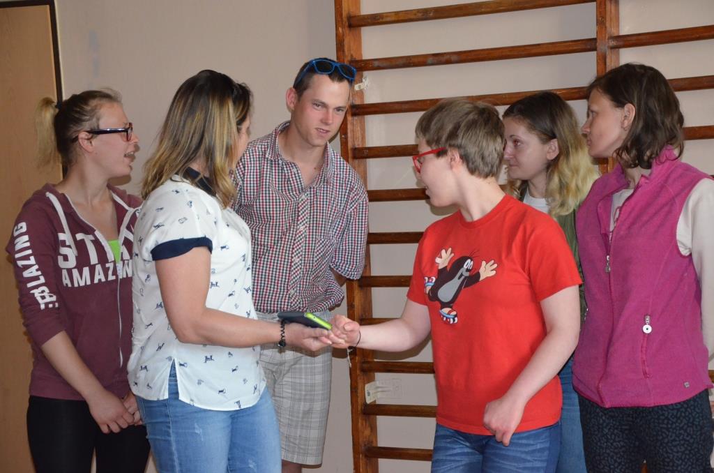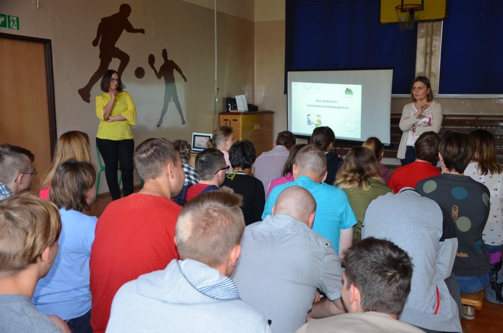 Podczas prezentacji multimedialnej nasi uczniowie poznali podstawowe pojęcia związane z rynkiem pracy, zatrudnieniem a także dowiedzieli się w jaki sposób szukać pracy po ukończeniu szkoły. Spotkanie odbywało się w Sali Gimnastycznej SOSW i miało także charakter integracyjny- nasi wychowankowie poznali młodzież z puckiej szkoły przysposabiającej do pracy.