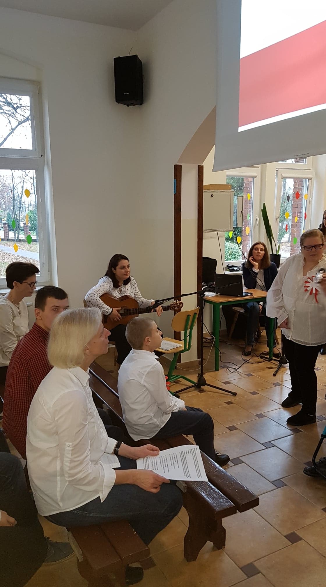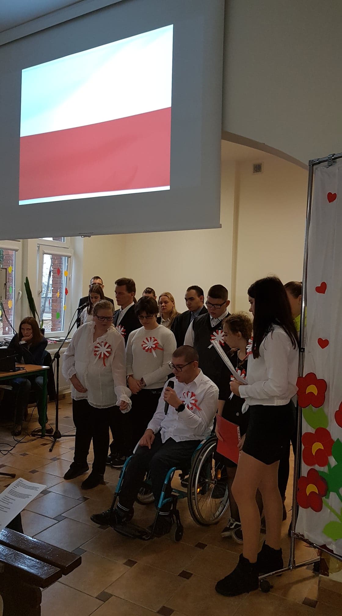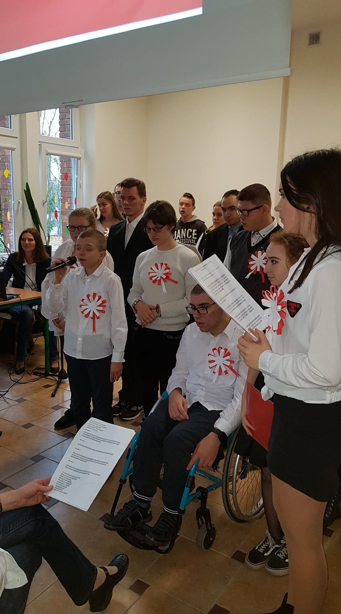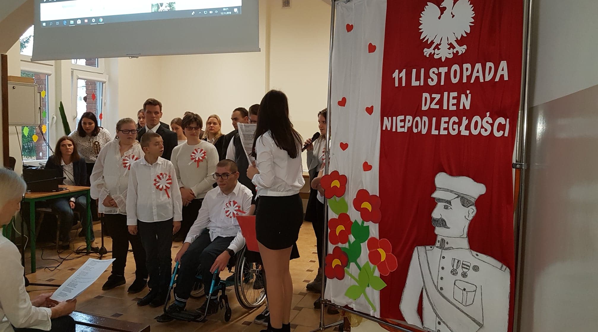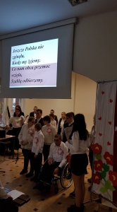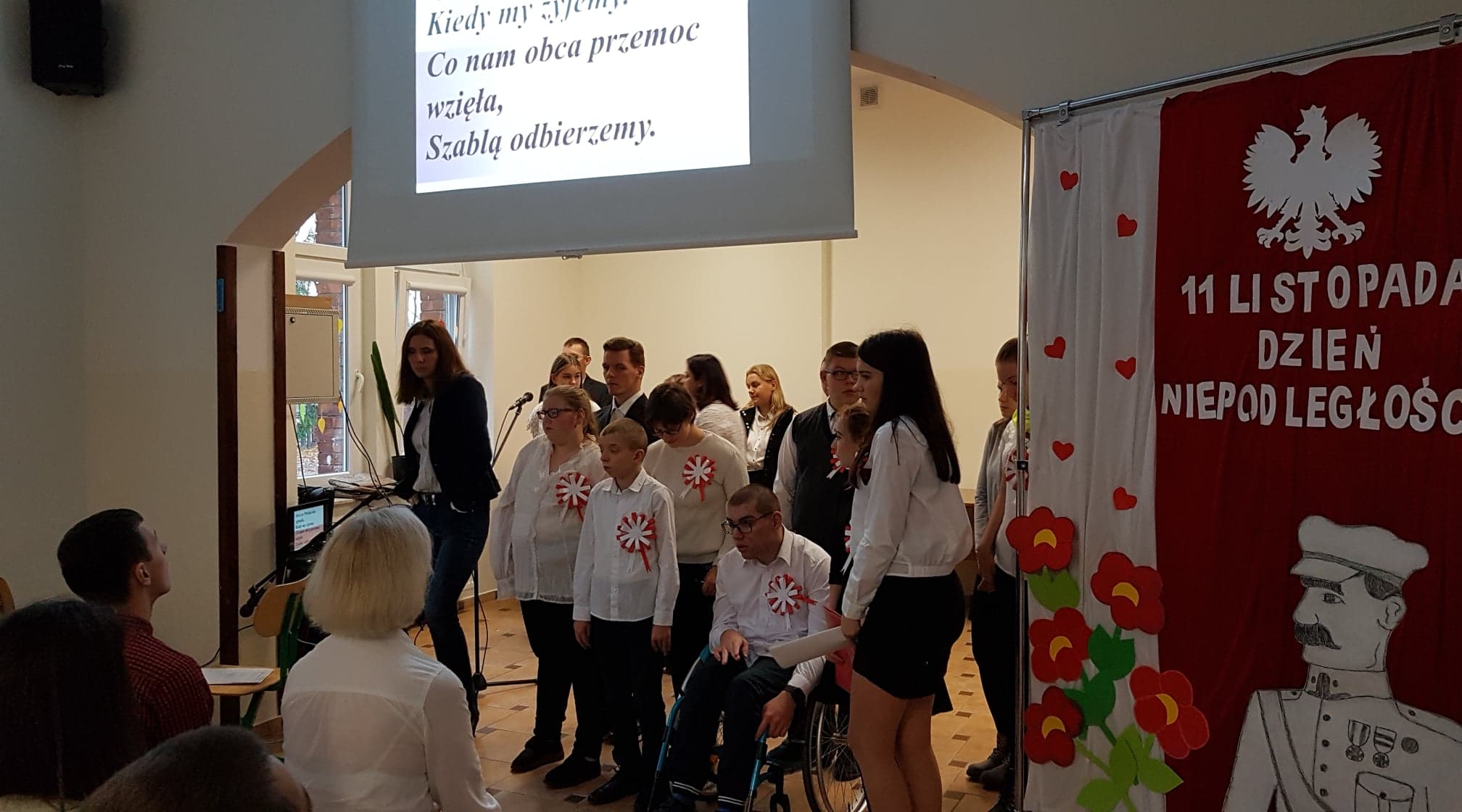 Tego dnia w auli szkolnej odbył się montaż słowno- muzyczny, który przypomniał historię naszego kraju, naszej ojczyzny i drogi jakie przeszła, zanim stała się wolna i niepodległa. Młodzież recytowała z pamięci wiersze o tematyce patriotycznej a wszyscy wspólnie śpiewali niepodległościowe pieśni i piosenki. Spotkaniu towarzyszyła podniosła i uroczysta atmosfera. Oprawą muzyczną uroczystości zajęła się pani Anna Brzezińska we współpracy z panią Katarzyną Bednarską, salę upiększyła pani Anna Nowicka, zaś nad całością imprezy czuwały panie Jolanta Kotkowska