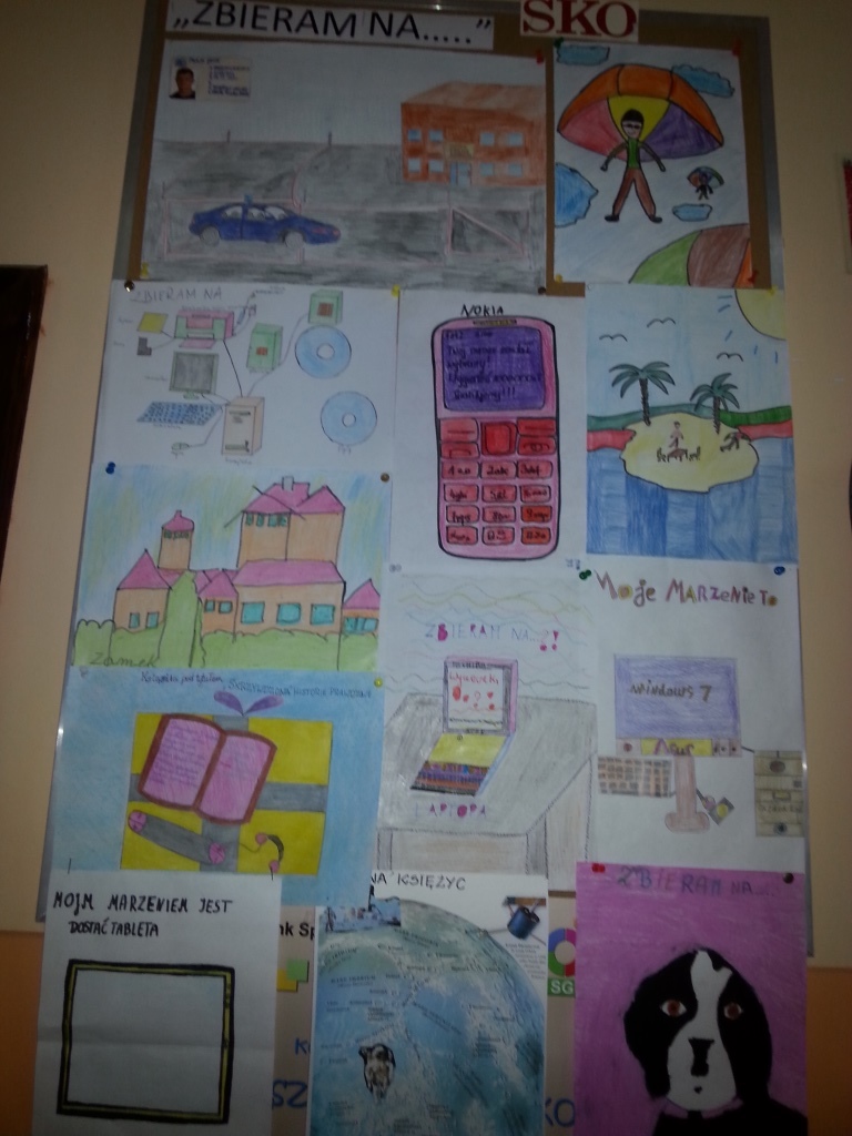 Do opiekuna Szkolnej Kasy Oszczędności wpłynęło ponad 20 prac. Wybór był trudny, gdyż w każdą pracę uczniowie włożyli bardzo dużo wysiłku. Rysunki były bardzo kolorowe i odzwierciedlały marzenia każdego z osobna. Ostatecznie wyłoniono trzy pierwsze miejsca: miejsce I – Wiktora Siwek z ZSZ, miejsce II Monika Orzłowska z ZSZ oraz miejsce III – Dariusz Pawluszkiewicz z SSPdP. Pozostali uczestnicy otrzymali słodki upominek.