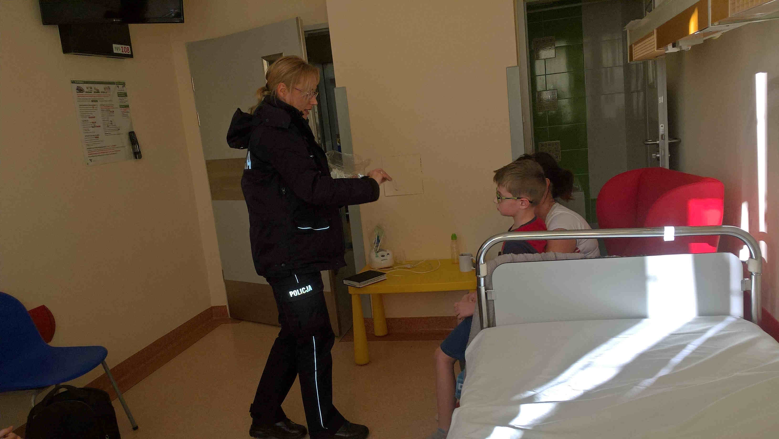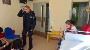 W tym roku małych pacjentów zaszczyciła swoją obecnością Pani Oficer Prasowy, asp. sztab. Anetta Potrykus, która przybliżyła dzieciom problemy współczesnego świata, uświadomiła o zagrożeniach wynikających z nieodpowiedzialnego korzystania z Internetu oraz przestrzegała przed zgubnym wpływem zażywania różnorodnych środków odurzających. Pani Anetta zwróciła też szczególną uwagę na konieczność bezpiecznego poruszania się po drogach zarówno w charakterze ich użytkowników, jak i pieszych. Wyczuliła dzieci na potrzebę noszenia stosownych elementów ochronnych i niezbędnych odblasków, które niejednokrotnie ratują życie i zdrowie.