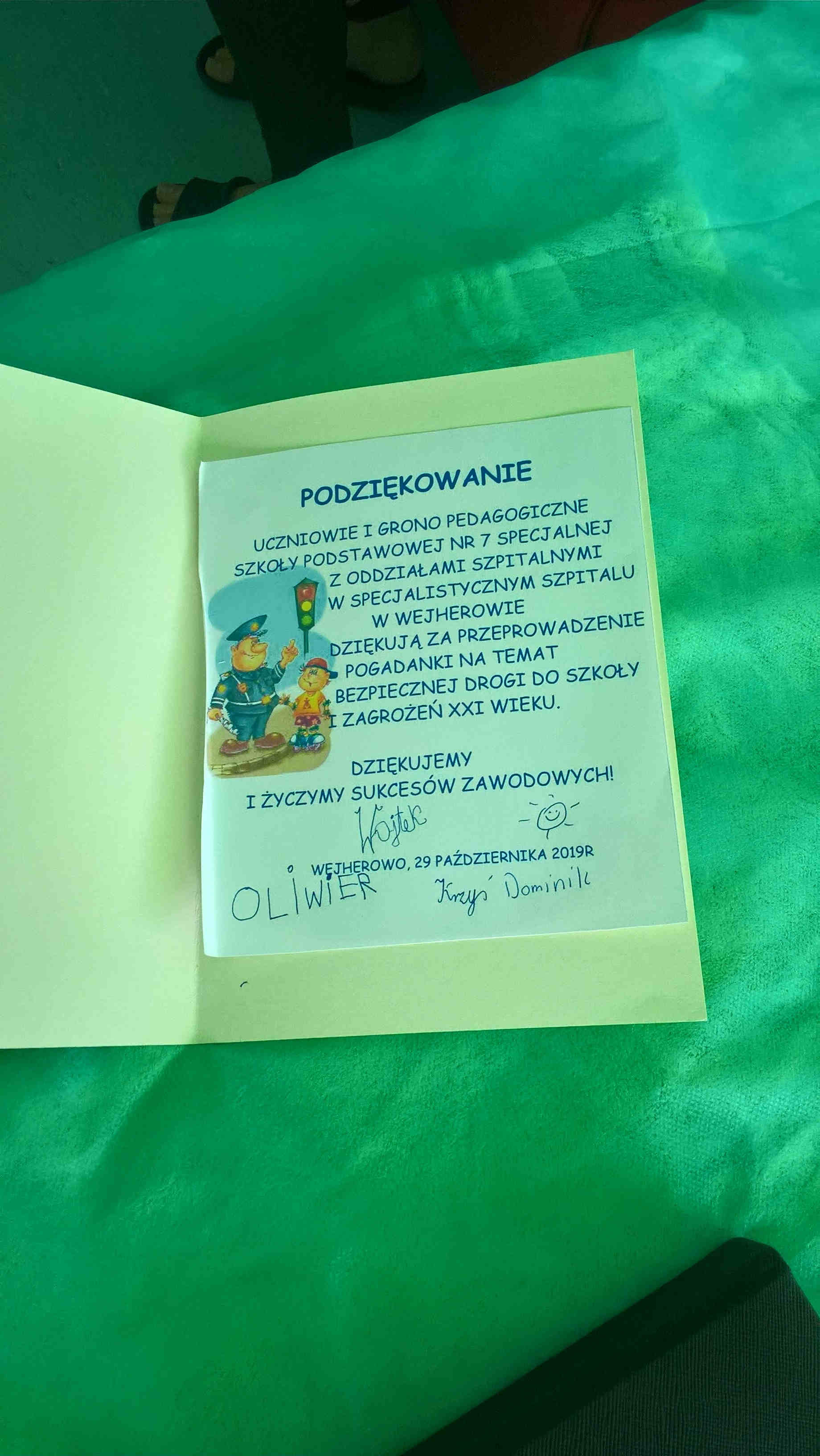 Na zakończenie spotkania dzieci otrzymały od przedstawicielki Komendy Powiatowej Policji w Wejherowie elementy odblaskowe, a dzieci zrewanżowały się własnoręcznie wykonaną laurką.