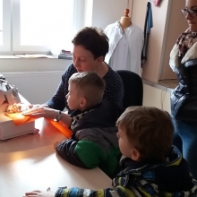 Zapoznaliśmy się również z pracą, jaką wykonuje kucharz i zawitaliśmy w kuchni PZKS, by poznać tajniki tego zawodu. Następnego dnia w swoim gabinecie serdecznie przyjęły nas panie pielęgniarki. Opowiedziały, czym się zajmują i pokazały przedszkolakom sprzęt, jakim dysponują. Mogliśmy się zważyć, zmierzyć i zbadać termometrem oraz stetoskopem.