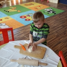 Kolejnego dnia mówiliśmy o pracy, jaką wykonuje piekarz. Chcieliśmy jak on spróbować ulepić chleb, tylko z masy solnej. Zabrakło nam soli, więc wybraliśmy się do sklepu spożywczego niedaleko przedszkola. Przestrzegając zasad bezpiecznego zachowania przy ruchliwej ulicy oraz właściwego przechodzenia przez jezdnię dotarliśmy do sklepu. Kupiliśmy sól oraz pieczywo.
