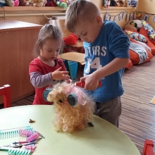Sami również próbowaliśmy pobawić się w fryzjerów i zajęliśmy się jedną z naszych przedszkolnych lalek. Czesaliśmy ją, upinaliśmy jej włosy, ale najfajniejsze było nakładanie pianki na włosy, utrwalającej fryzurę.