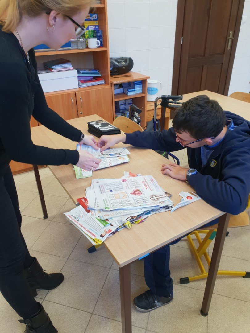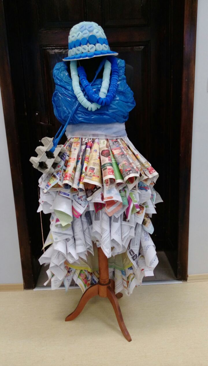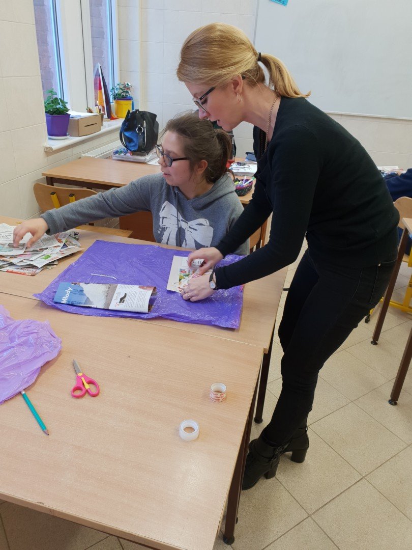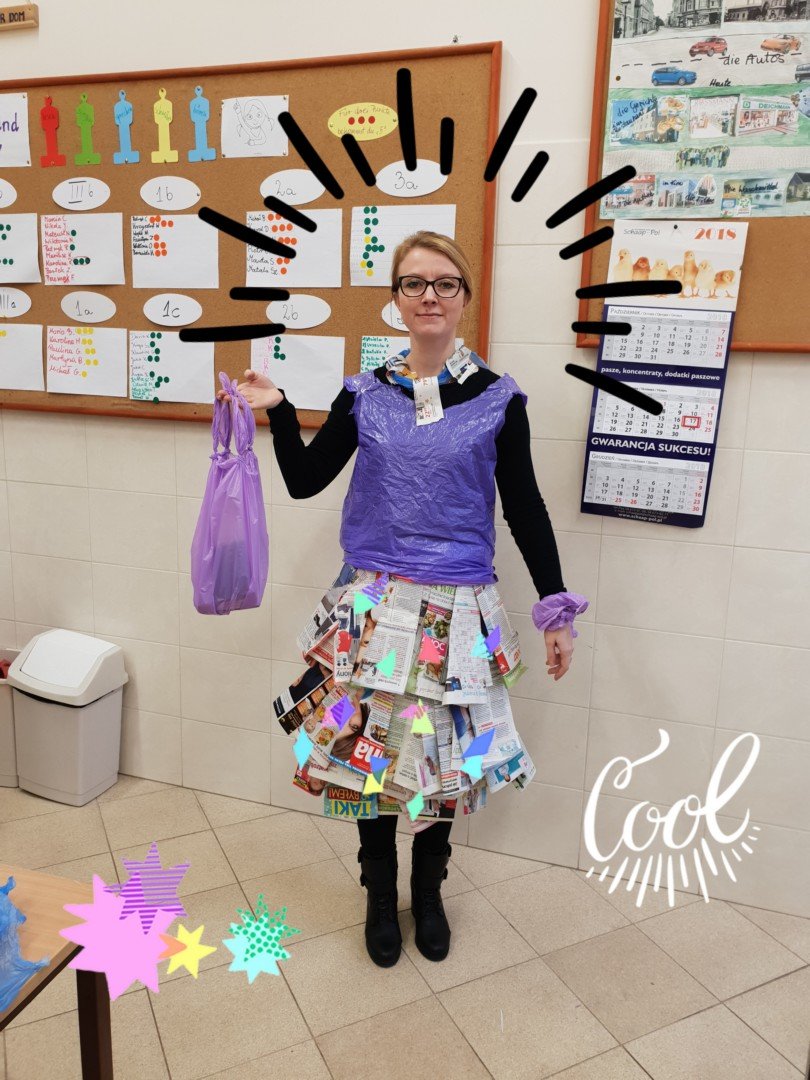 Do współpracy zaprosiliśmy panią Patrycję Janca z SSPdP, która pokazała nam jak w prosty sposób wykonać „elegancki strój” ze zbędnych worków i gazet. Korzystając z efektownego przykładu postanowiliśmy zrobić sukienkę (ein Kleid) i torebkę (eine Handtasche) dla pani Justyny.