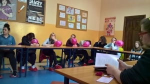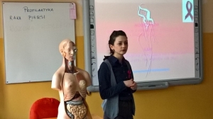 6 kwietnia w gimnazjum i ZSZ upłynął pod hasłem „Różowa wstążeczka”. Tego dnia przeprowadzono warsztaty profilaktyki raka piersi i chorób nowotworowych. W zajęciach uczestniczyły dziewczynki z trzeciej klasy gimnazjum i uczennice zasadniczej szkoły zawodowej. Marzena Kuczkowska – nauczycielka biologii i chemii oraz Zofia Pioterek – nauczycielka wychowania do życia w rodzinie przeprowadziły pogadankę na temat czynników ryzyka zachorowania na raka piersi. Dodatkowo wyjaśniły techniki samobadania, przedstawiły prezentację ukazującą statystyki występowania choroby u kobiet i mężczyzn oraz omówiły sposoby diagnozowania i leczenia. Tematyka związana z rakiem piersi cieszyła się sporym zainteresowaniem wśród uczennic, które zadawały wiele pytań i z uwagą śledziły prezentację. Na zakończenie uczestniczki rozwiązywały na tablicy interaktywnej krzyżówkę dotyczącą zdrowia.