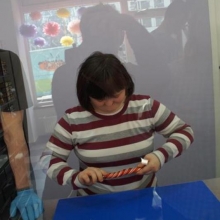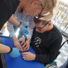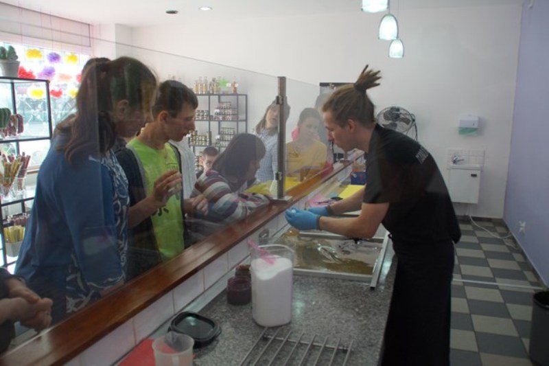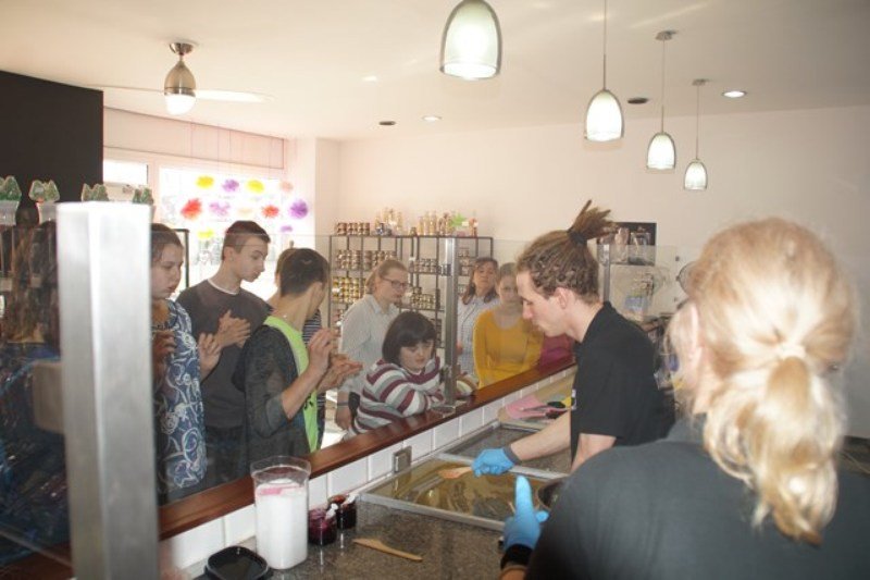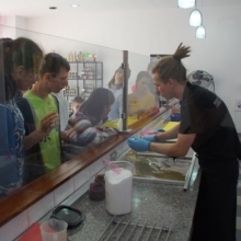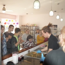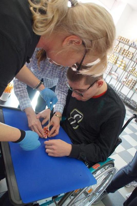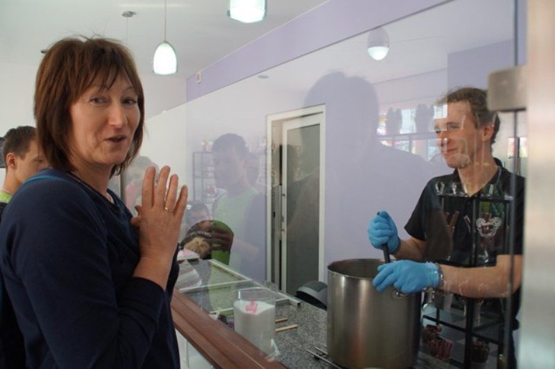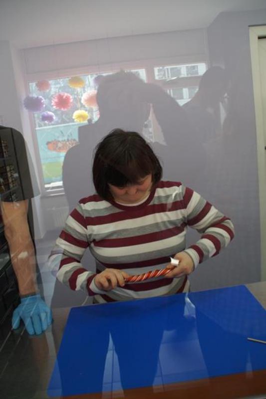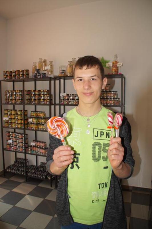 Wizyta w fabryce cukierków wywołała na uczniach duże wrażenie. Wesoły Pan Patryk zaprezentował wszystkim proces ręcznego wyrabiania bajecznie kolorowych i aromatycznych słodyczy. Młodzież miała okazję samodzielnie wykonać lizaki. Wbrew pozorom nie było to łatwe zadanie, wymagało ono znacznej siły i sprawności.