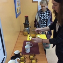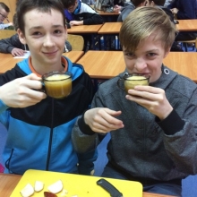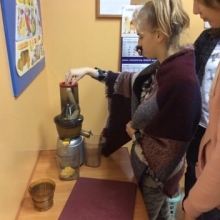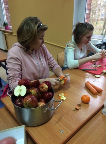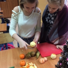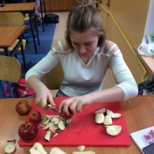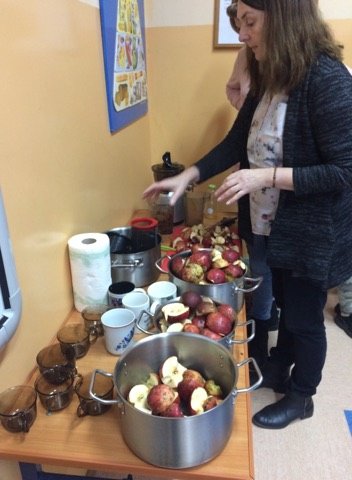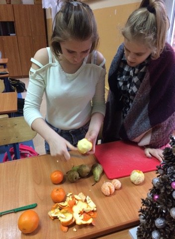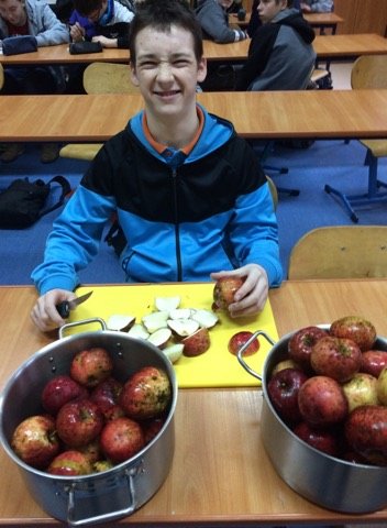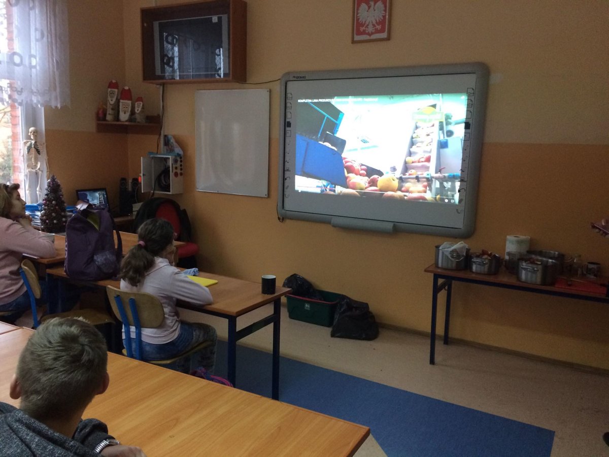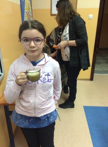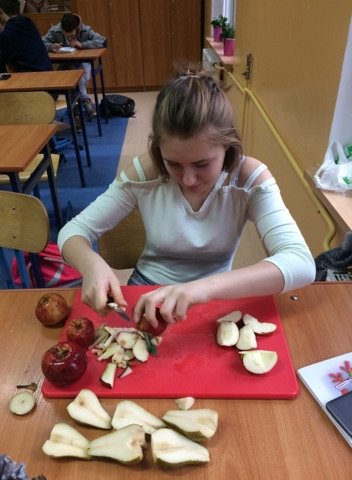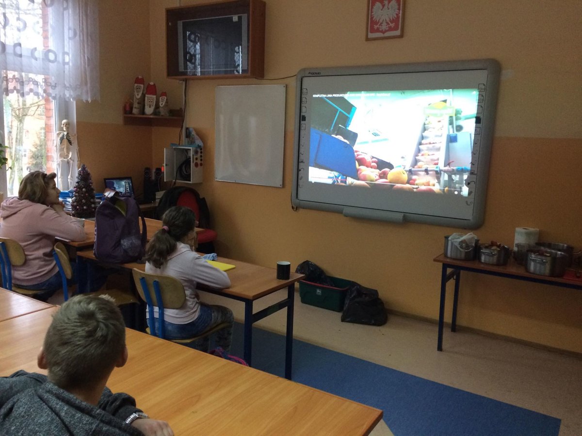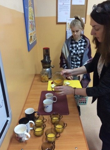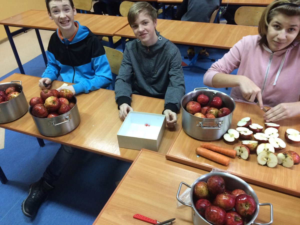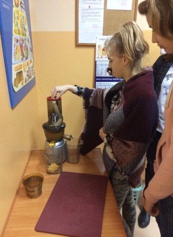 Dnia 12 stycznia 2018 roku w naszym szkolnym Klubie Rozsądnych Jadłożerców odbyły się niezwykłe zajęcia. Przez dwie godziny myliśmy, obieraliśmy i kroiliśmy mnóstwo owoców, a wszystko po to aby następnie, wytłoczyć z nich pyszne i zdrowe soki. Nasza wychowawczyni pani Krystyna Milewska-Mattar przywiozła do szkoły wytłaczarkę do owoców i pomogła nam wykonać nasze zadanie. W pierwszej kolejności powstał sok pomarańczowy, potem bananowo-gruszkowy i kolejno marchwiowo-jabłkowy. Jabłka okazały się największym wyzwaniem, było ich najwięcej, a żeby wytłaczarka nie uległa zniszczeniu musieliśmy pozbawić je, zdrewniałych części. Poza tym, ilość jabłek była ogromna, dzięki czemu nasz zdrowy sok, posilił również naszych szkolnych kolegów i koleżanki, a także nauczycieli. Te zajęcia, okazały się ciężką pracą, lekcją zdrowego odżywiania jak również szkołą niemarnowania. Cały worek wytłoczyn owocowych zapakowaliśmy w worek i sprezentowaliśmy naszemu koledze Antosiowi, który w gospodarstwie rodziców ma świnki. Podobno bardzo cieszyły się z kolacji. Uwieńczeniem naszego wysiłku był odpoczynek przy filmie o polskiej wytwórni soków tłoczonych „Tęczowy ogród” i szklaneczce własnoręcznie tłoczonego soku.