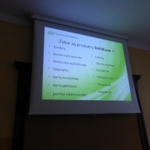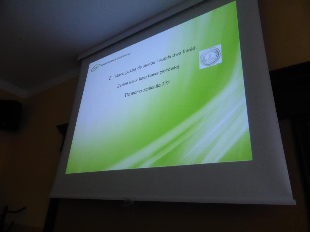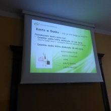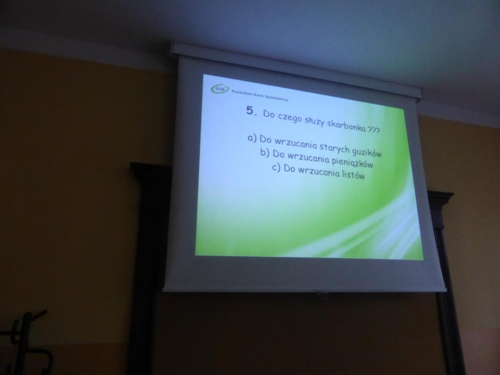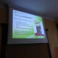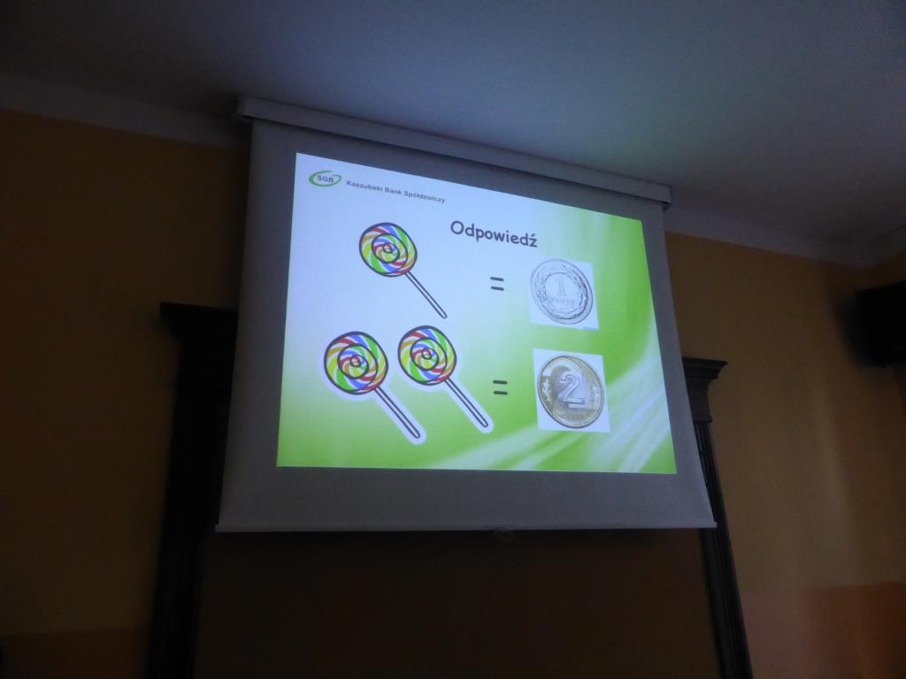 Podczas tego spotkania wspólnie przypomnieliśmy sobie czym jest Szkolna Kasa Oszczędności, w jaki sposób można do niej dołączyć i tym zacząć oszczędzać pieniądze na własnych kontach. Pani Dorota w czasie przygotowanej przez siebie prezentacji przybliżyła takie pojęcia jak: bank, bankomat, kredyt, waluta, lokata, oprocentowanie, karta bankomatowa, karta kredytowa. Zwróciła również uwagę na niebezpieczeństwa związane ze zgubieniem karty bankomatowej czy dowodu osobistego. Dodatkową atrakcją spotkania był krótki konkurs, w którym przedstawicielka banku zadawała uczniom pytania z wiedzy o bankowości. Nagrodami były przeróżne gadżety z logiem Banku Spółdzielczego.