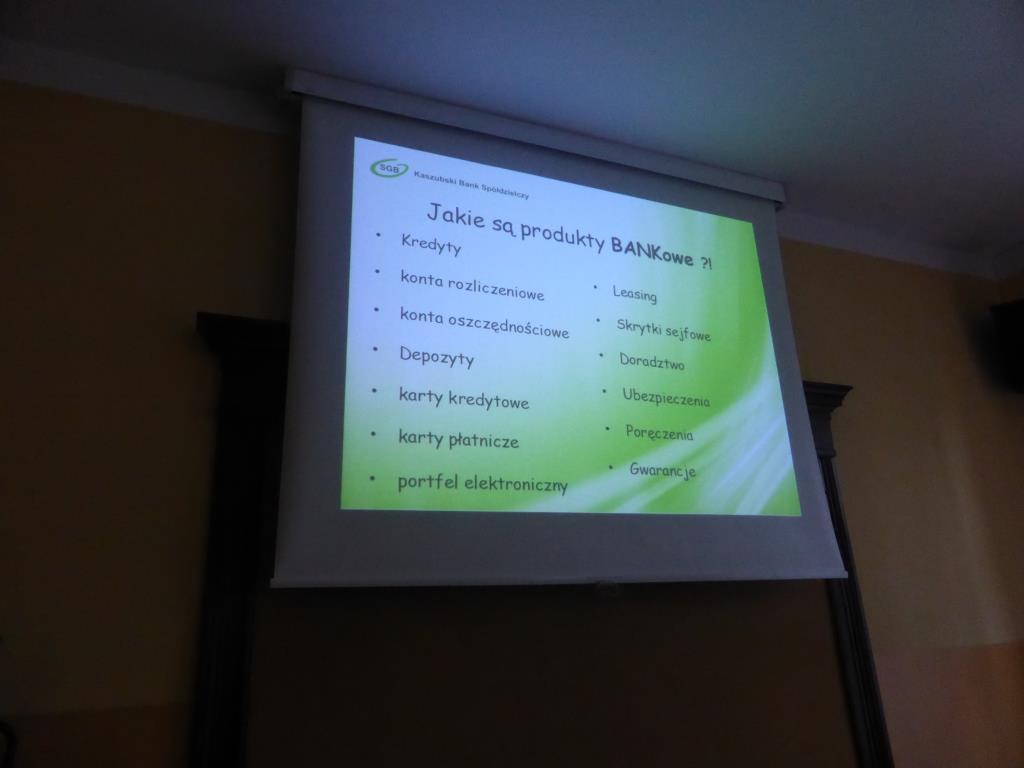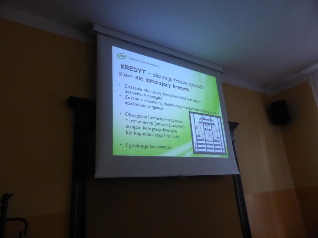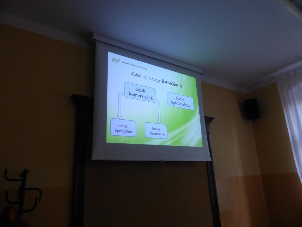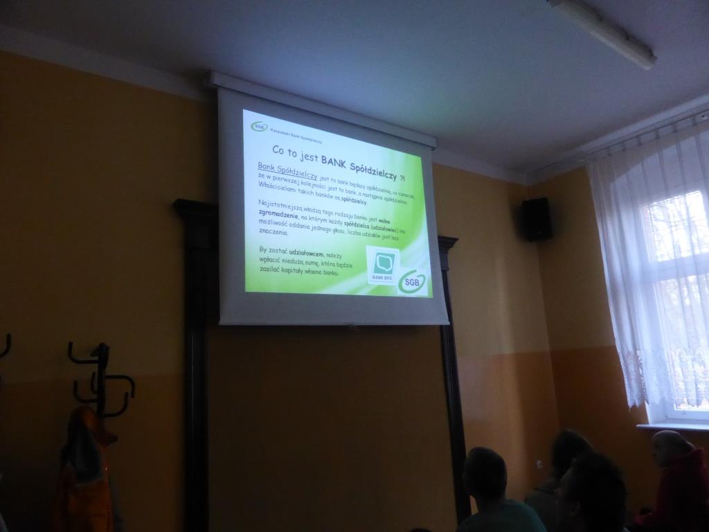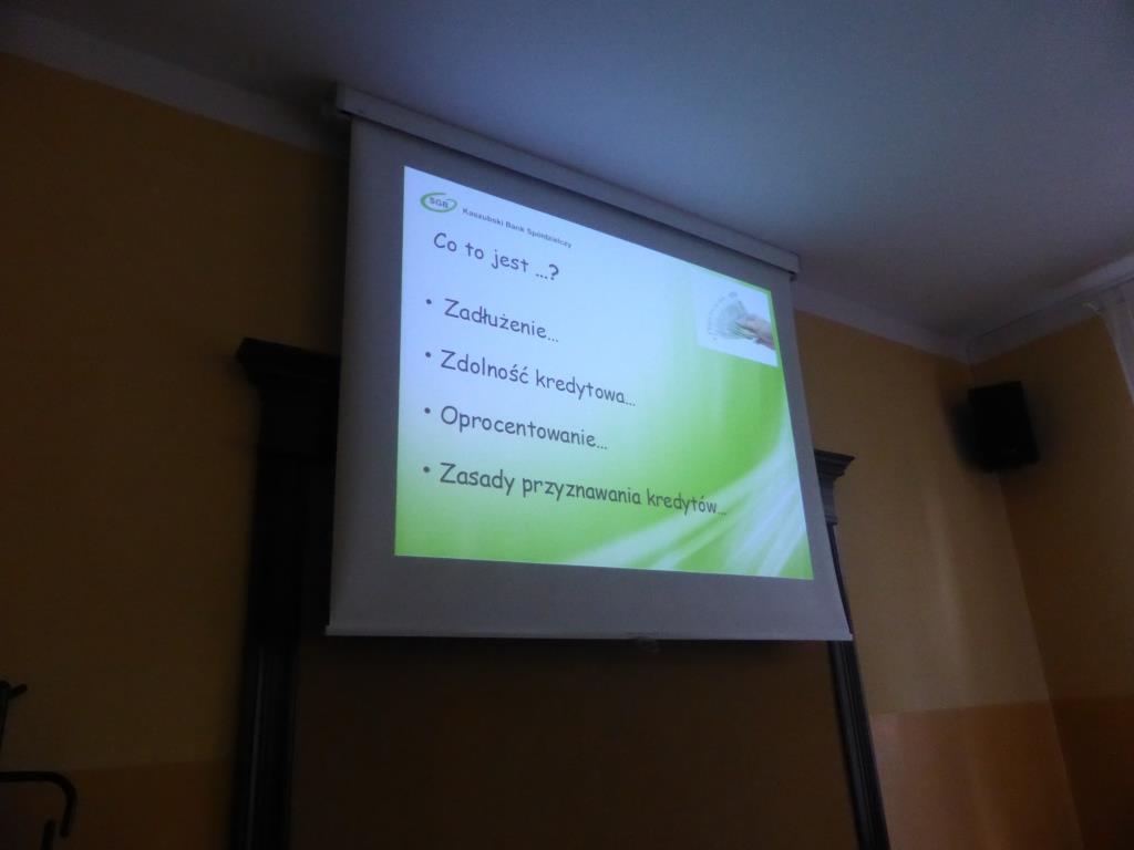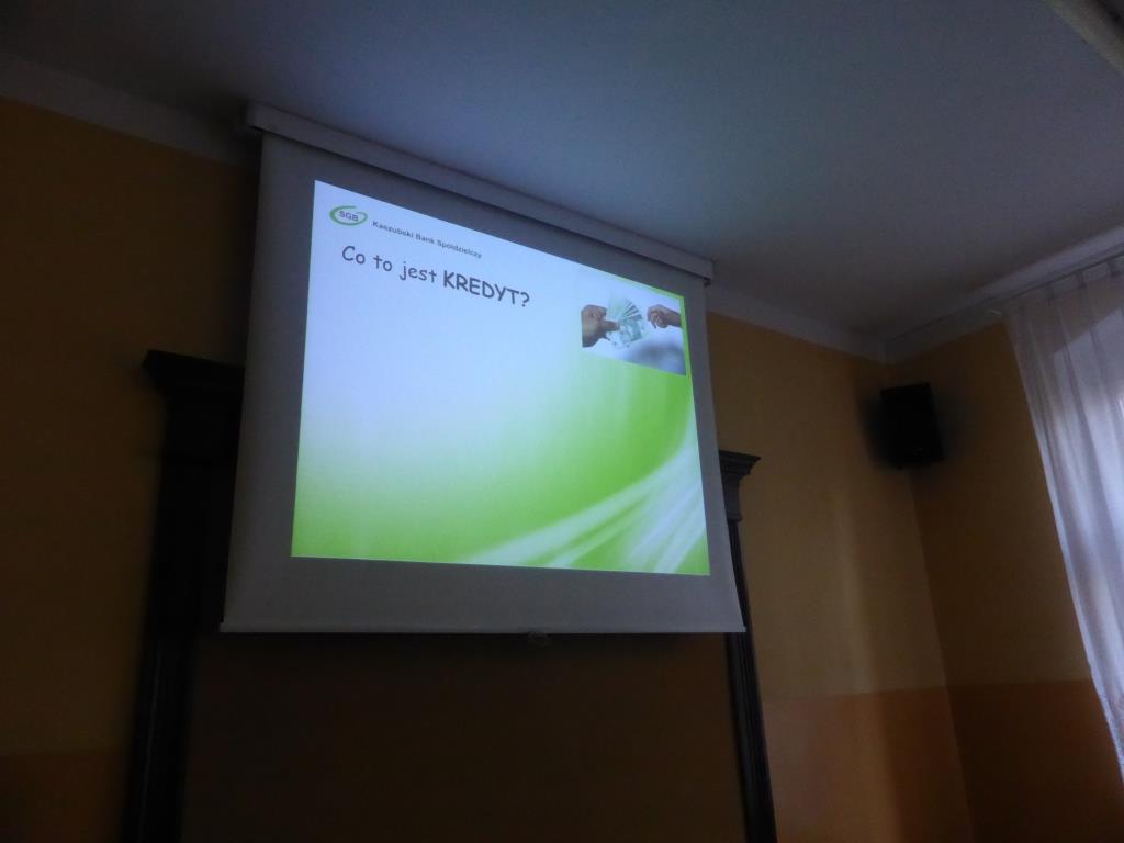 Dnia 17 grudnia w naszej szkole uczniowie gimnazjum oraz ZSZ odbyli spotkanie z przedstawicielem Kaszubskiego Banku Spółdzielczego w Wejherowie, panią Dorotą Zborowską.