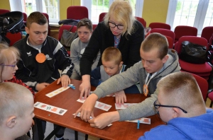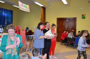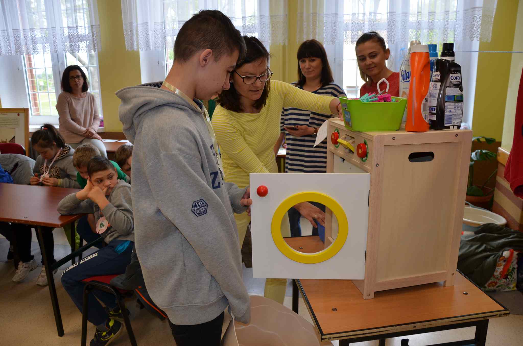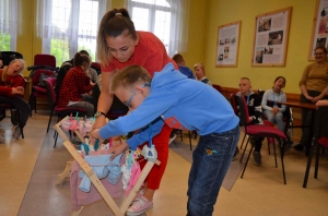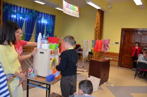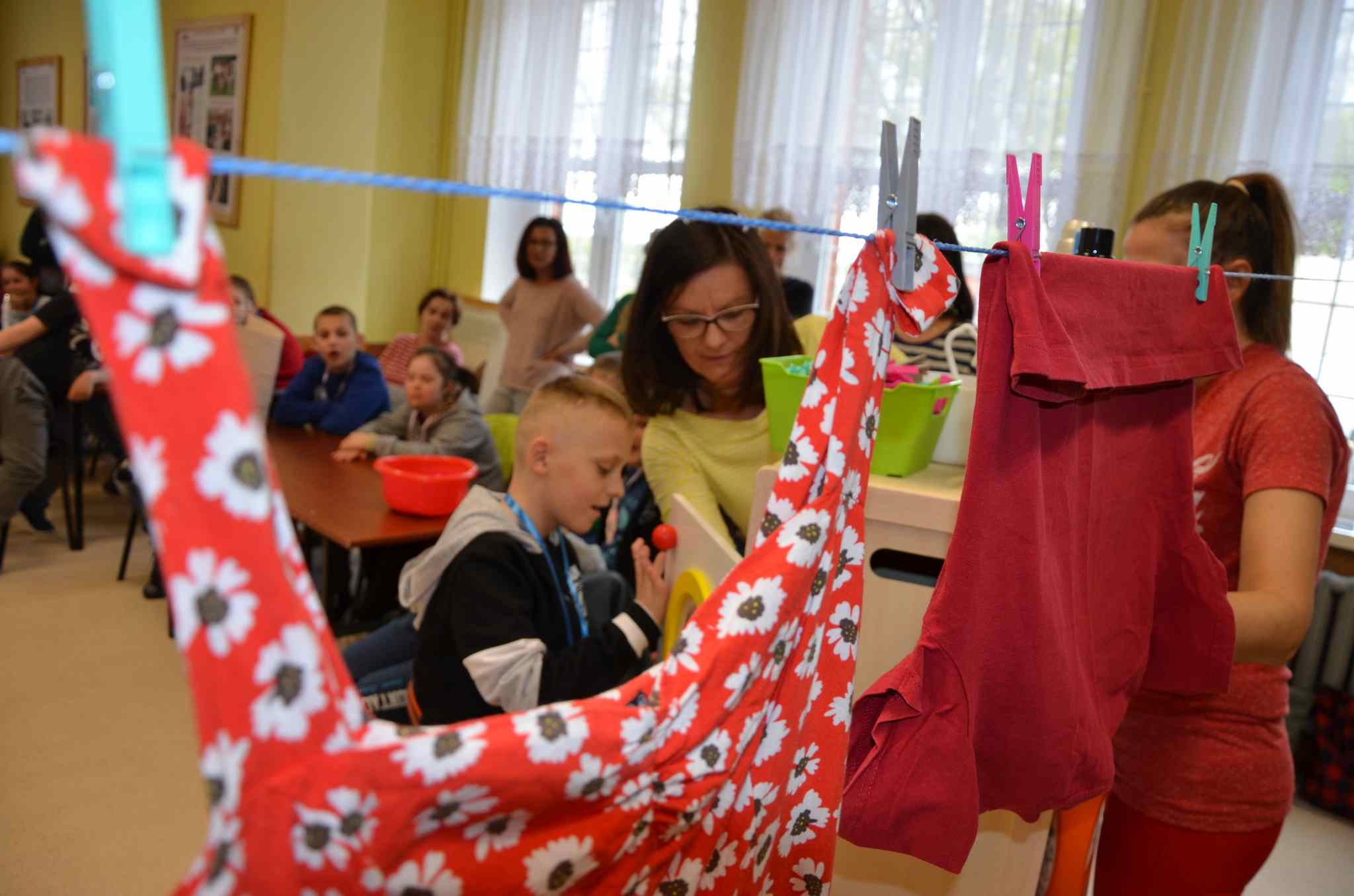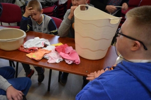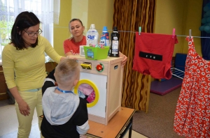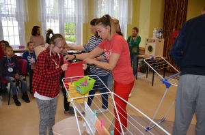 Zadaniem uczestników było nazwanie poszczególnych części garderoby, wyszukiwanie takich samych, segregowanie na duże i małe, eliminowanie nie pasujących elementów, układanie i kontynuowanie ubraniowych sekwencji czy przypinanie klamerkami do sznurka wypranych i rozwieszonych spodni, sukienek, skarpetek lub bluzek. Wszystkie te zadania pochłaniały uczestników bez reszty, ale prawdziwym przebojem było zadanie polegające na zrobieniu prania. Przedstawiciele poszczególnych zespołów maszerowali w kierunku prawie prawdziwej pralki i kącika z pełnym wyposażeniem pralni (proszki, kapsułki, płyny do płukania itp.), wkładali swoje pranie do pralkowego bębna, uruchamiano program i aulę zaczynał wypełniać głośny dźwięk prania, a potem wirowania – było cicho, jak makiem zasiał. To były prawdziwe emocje! Móc zrobić wszystko tak, jak mama. Przecież warto to wiedzieć i umieć sobie samemu poradzić! Zabawa w dom jest ponadczasowa i można z niej wynieść wiele umiejętności potrzebnych w codziennym życiu.