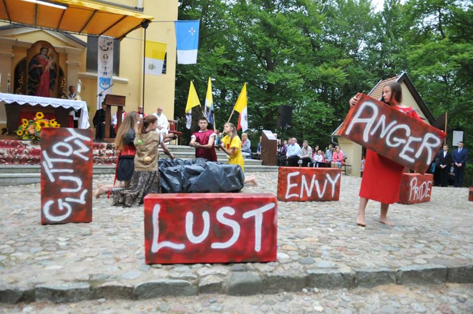 Tę wyjątkową Eucharystię poprzedziła procesja z Najświętszym Sakramentem- która wyruszyła z kościoła pw. Św. Anny- oraz pantomima pt. „Siedem grzechów” w wykonaniu grupy „Mix Blue”.
